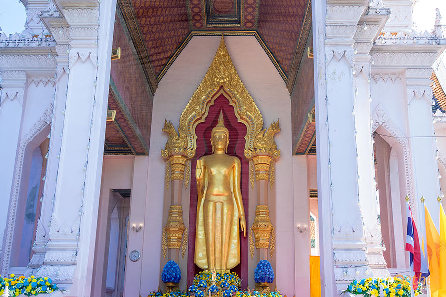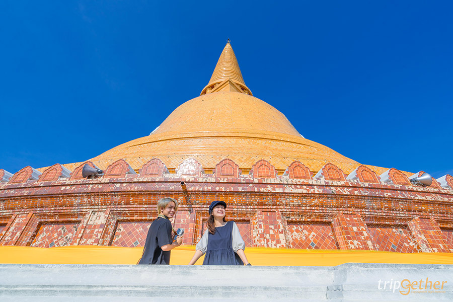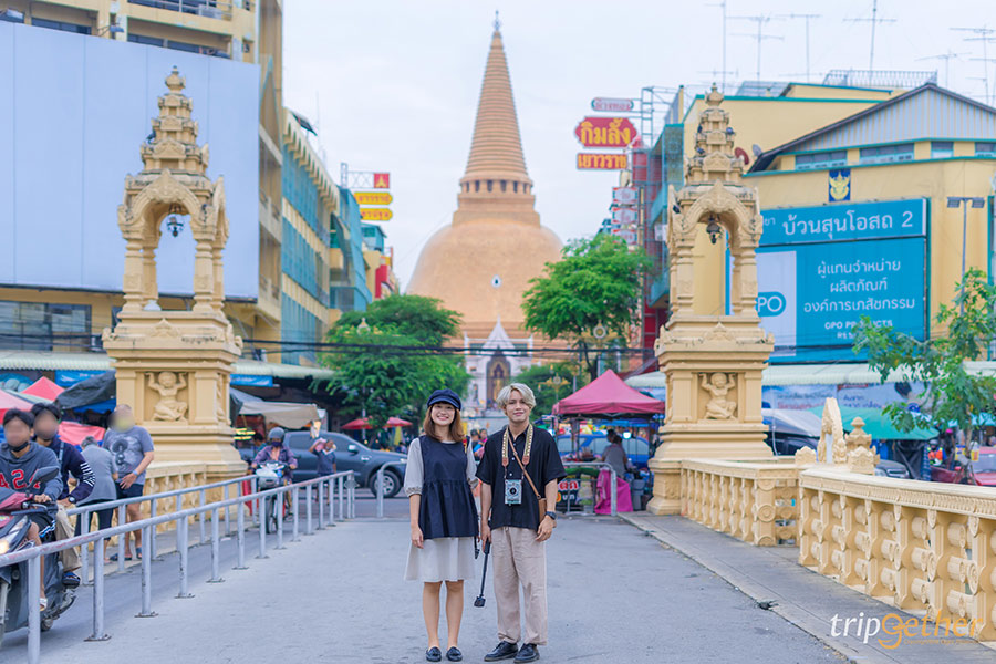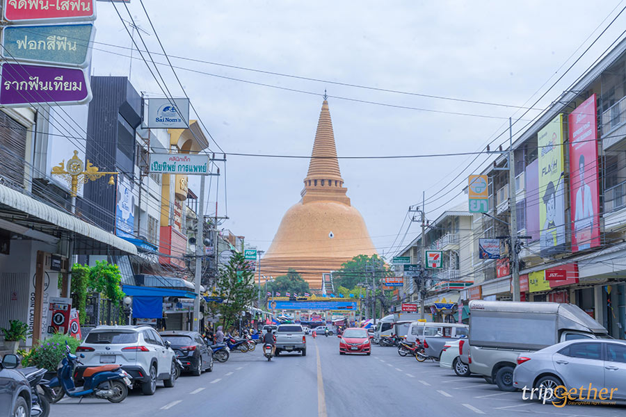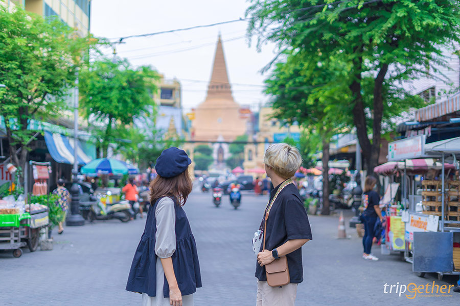 เดินผ่านตลาดมาเพียงนิดเดียว เราก็มาถึงวัดพระปฐมเจดีย์ วัดเก่าแก่และแลนด์มาร์กคู่บ้านคู่เมืองของนครปฐม เรามาช่วงที่ตรงกับงานเทศกาลนมัสการองค์พระปฐมเจดีย์พอดี เลยทำให้บรรยากาศของวัดคึกคักและเต็มไปด้วยผู้คน
