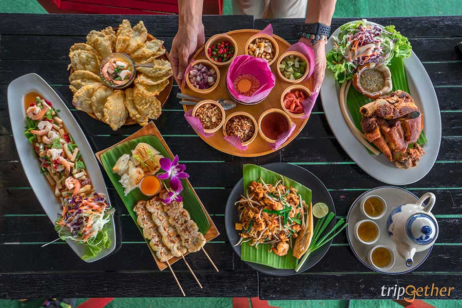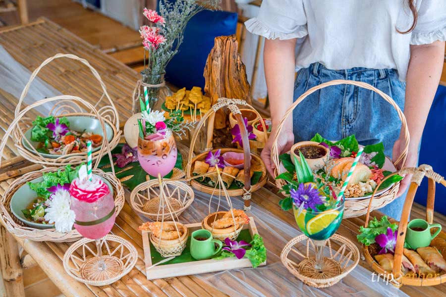 ในส่วนอาหารก็มีครบทั้งอาหารจานหลัก ของกินเล่น ขนมหวาน และเครื่องดื่ม ไม่รอช้าเราพากันสั่งอาหารที่ทางร้านแนะนำกันมาแบบจัดเต็มไม่ว่าจะเป็น เมี่ยงคำส้มโอ สุดเฮลตี้ หมูสะเต๊ะ กุ้งหิมะกรุบๆ พร้อมนเมนูคลาสสิกอย่าง เซ็ตไอติมกะทิข้าวเหนียวมะม่วง และเครื่องดื่มอย่าง Pink milk latte กับ Rose lychee soda