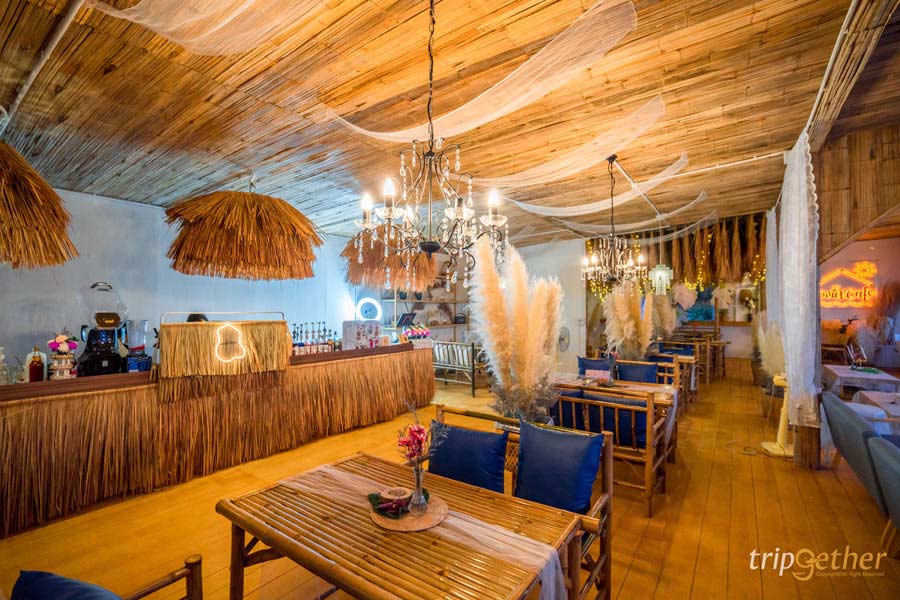 ภายในร้านตกแต่งโดยเน้นวัสดุธรรมชาติ ไม่ว่าจะเป็นไม้ไผ่ หญ้าแฝก รวมทั้งดอกเลาที่มีสีขาวเทาปุกปุยสุดน่ารัก