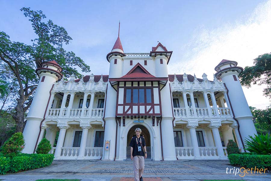 เดินเล่นกันมาจนถึงบริเวณด้านหลังของพระตำหนักชาลีมงคลอาสน์ บริเวณริมสระน้ำ ก็จะพบกับ พระตำหนักมารีราชรัตบัลลังก์ พระตำหนักไม้สักทองสองชั้นทรงยุโรป สีแดง สถาปัตยกรรมแบบนีโอคลาสสิก พร้อมด้วยทางเชื่อมทอดยาวเหนือสระน้ำ บอกเลยว่าของจริงสวยมาก แน่นอนว่าเราไม่พลาดที่จะเก็บภาพมาฝากเพื่อนๆ