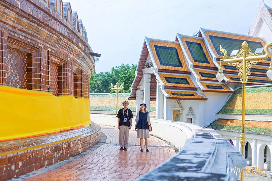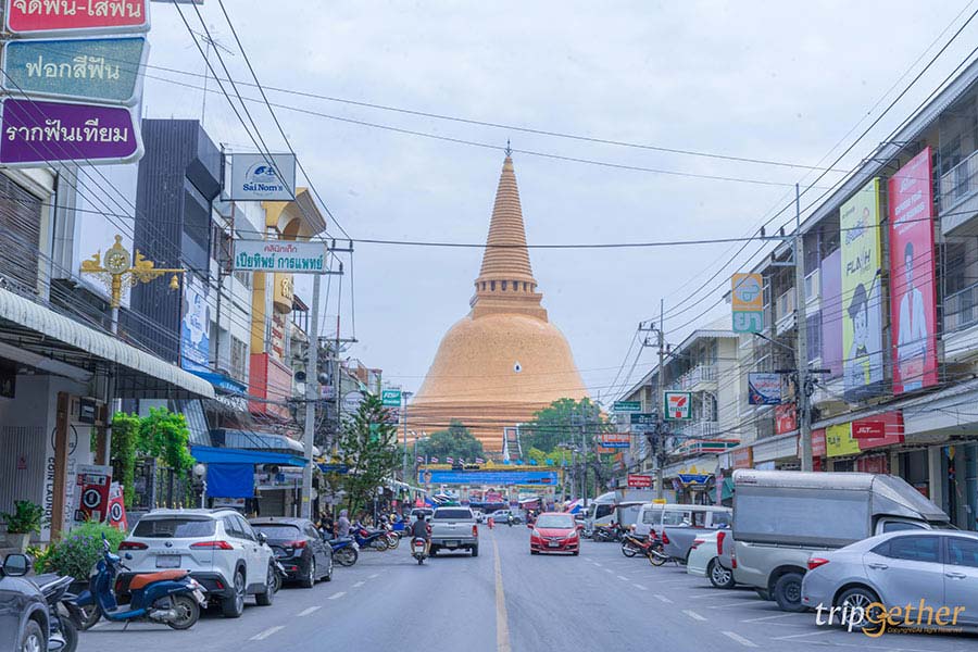 ไปกันต่อกับจุดแลนด์มาร์กของนครปฐมที่ใครมาแล้วก็ต้องไหว้สักการะ องค์พระปฐมเจดีย์ เป็นเจดีย์ทรงสีทองอร่ามตั้งโดดเด่นตระหง่านเป็นศูนย์กลางของเมืองนครปฐม ภายในเป็นที่ประดิษฐานพระบรมสารีริกธาตุขององค์สมเด็จพระสัมมาสัมพุทธเจ้า เรียกได้ว่าเป็นองค์พระที่ยิ่งใหญ่อลังการและมีความสำคัญเคียงคู่คนนครปฐมมาอย่างยาวนาน โดยเราขับรถจากบางเลนมาที่นี่ใช้เวลาประมาณ 40 นาที