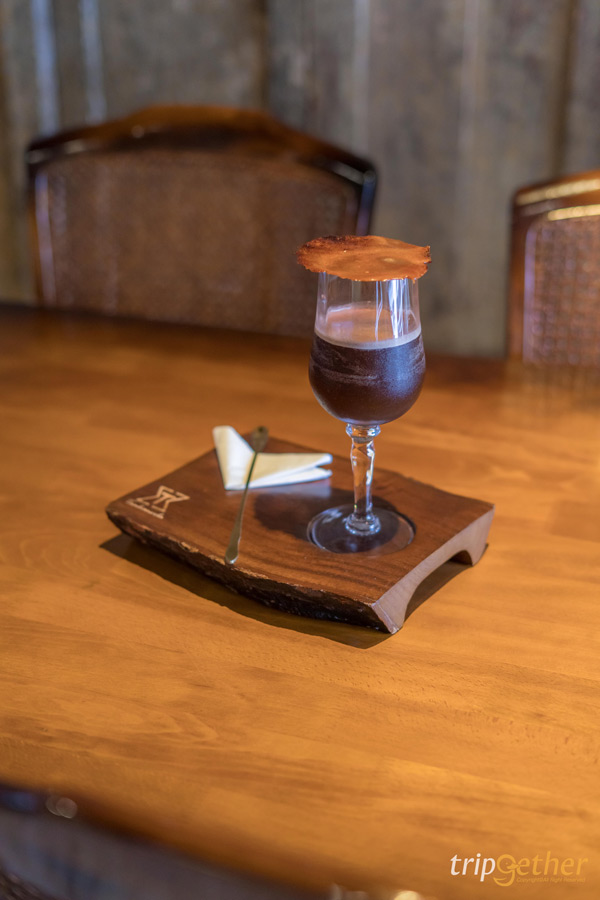 ด้านบนแก้วจะมีแผ่นน้ำตาลทรายแดงสามารถใช้ช้อนเคาะให้น้ำตาลแตกแล้วตกลงในแก้วได้ เพิ่มกิมมิคชิคๆ