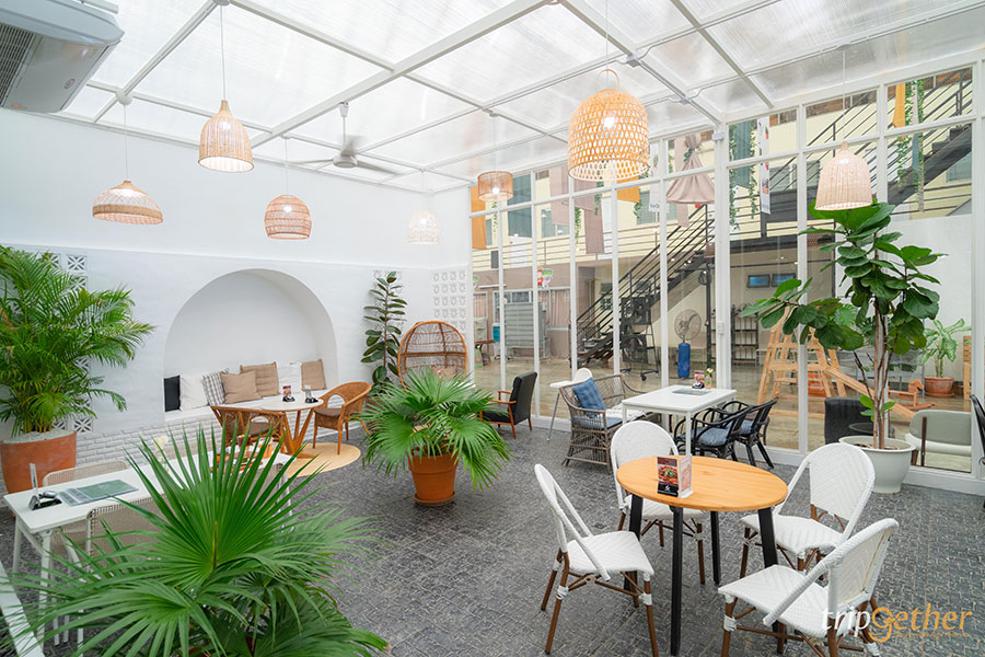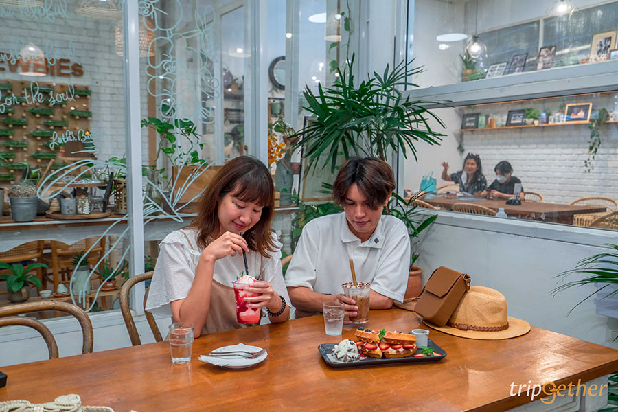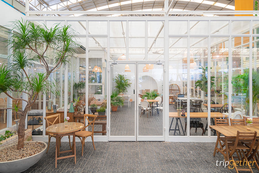 เผลอแป๊ปเดียวก็ใช้เวลาไปกับการเลือกซื้อของนานมาก เราก็เลยเดินเข้ามานั่งพักผ่อนในโซนคาเฟ่ของทางร้านหน่อย ตัวคาเฟ่ออกแบบเหมือนเรือนกระจก ดูโล่งโปร่ง และสบายตาด้วยโทนสีขาวและสีไม้ อีกทั้งการตกแต่งร้านก็ดูน่ารักเข้ากับบรรยากาศสวนมาก ด้วยตุ๊กตาเซรามิกน่ารักๆ ต้นไม้เล็กๆ ให้ฟีลสบายๆ เหมาะกับการมาพักผ่อนจริงๆ ส่วนที่นั่งก็มีทั้งเอาท์ดอร์และอินดอร์ห้องแอร์ เห็นห้องแอร์เย็นฉ่ำแบบนี้เราก็รีบพุ่งไปจองโต๊ะก่อนเลย