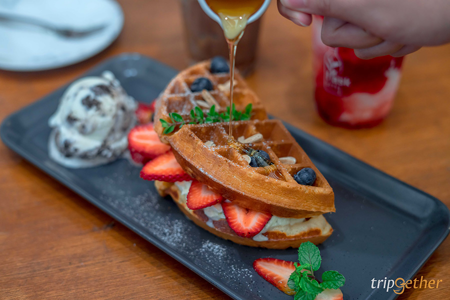 ต่อความหวานด้วย Waffle Set แป้งวาฟเฟิลหอมๆ สอดไส้วิปครีมนุ่มๆ นัวๆ ตัดหวานด้วยสตรอว์เบอร์รี่ฉ่ำๆ กินคู่กับไอศกรีมเย็นๆ บอกเลยว่าฟินมากๆ แล้วถ้าใครชอบรสหวานก็สามารถราดน้ำเชื่อมเพิ่มเข้าไปได้อีก และทั้งหมดนี้ราคา 187 บาท