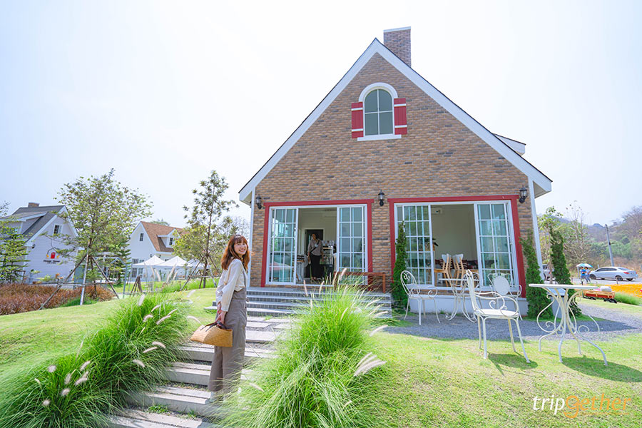 เดินเข้ามาจะเจอกับบ้านสไตล์คอทเทจ มีกลิ่นอายความเป็นยุโรปอิงลิช บริเวณร้านรายล้อมไปด้วยทุ่งหญ้า ทุ่งดอกไม้ แถมยังมีเขาจีนแลตั้งโดดเด่นเป็นฉากหลัง บอกเลยว่าสวยเหมือนอยู่ชนบทอังกฤษ ส่วนบรรยากาศในร้านก็ดูอบอุ่น มีความเป็นกันเอง มาถึงแล้วเราก็สั่งมินท์ช็อกโก 75 บาท หวานเย็น หอมมินท์สดชื่น เหมาะกับอากาศร้อนสุดๆ นอกจากนี้ทางร้านก็มีขายชา กาแฟ สมูทตี้ และเบเกอรี่น่ากินมากมาย เห็นแบบนี้เราก็เลยสั่งชีสเค้กหน้าไหม้ 95 บาทและช็อกโกแลตร้อน 60 บาท แต่ไม่ได้กินตอนนี้นะ เราตั้งใจจะซื้อไปเป็นขนมกินเล่นชิลล์ๆ สำหรับปิกนิกในสถานที่ต่อไป