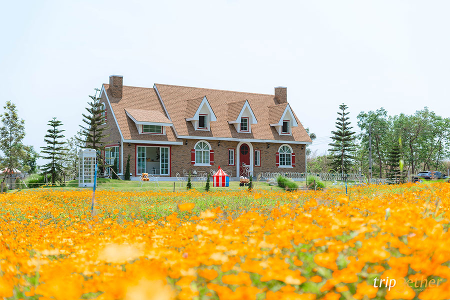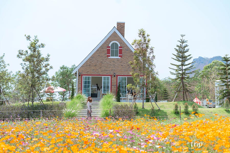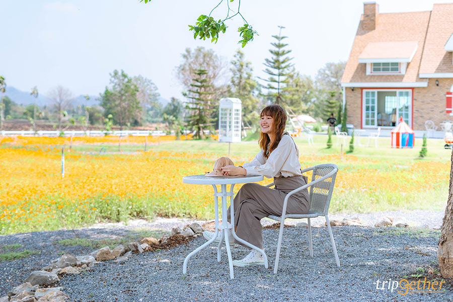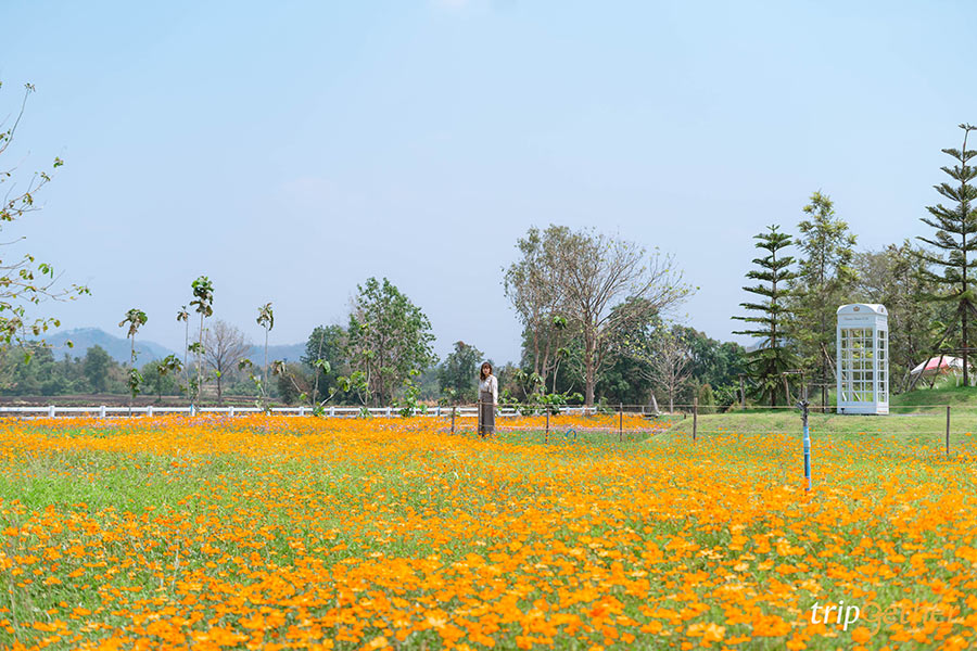 ไฮไลท์ที่ห้ามพลาดก็คือถ่ายรูปกับทุ่งคอสมอสสีส้มสดใส บอกเลยว่าถ่ายรูปมุมไหนก็สวย ในช่วงที่เรามาเป็นช่วงที่ดอกคอสมอสเริ่มบาน แต่ยังไม่ได้ full bloom เต็มที่ ถ้าใครอยากได้ภาพทุ่งคอสมอสบานเต็มๆ แนะนำให้มาช่วงเดือนเมษายน – พฤษภาคม รับรองได้ภาพดอกไม้เต็ม ส่วนใครมานอกจากช่วงนี้แนะนำให้ทักถามทางร้านก่อน จะได้ไม่พลาดดอกไม้สวยๆ แบบนี้