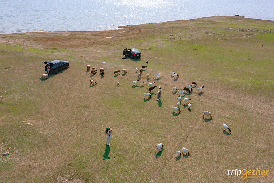 พักผ่อนชิลล์ๆ ถ่ายรูปกันเต็มที่แล้วก็ขับรถมาต่อที่ไฮไลท์ของเราในวันนี้ ปักหมุดมาที่ “นิวซีแลนด์ เมืองไทย 2” หรือ ท้ายเขื่อนป่าสักชลสิทธิ์ เป็นที่เที่ยวลพบุรีที่เที่ยวได้แค่ช่วงต้นปีเท่านั้นหรือก็คือประมาณเดือนมีนาคม – พฤษภามคม เพราะเป็นช่วงที่น้ำเขื่อนลดระดับจนเห็นทุ่งหญ้าเขียวขจี หลายคนที่มาก็ชอบปูผ้าปิกนิกหรือไม่ก็ตั้งแคมปป์ชิลล์ๆ นั่งมองวิวทุ่งหญ้าเขียวๆ มีฉากหลังเป็นภูเขาลูกใหญ่และผืนน้ำกว้างๆ แถมยังมีฝูงน้องแพะ น้องแกะออกมาเดินกินหญ้า บอกเลยว่าน่ารักสุดๆ