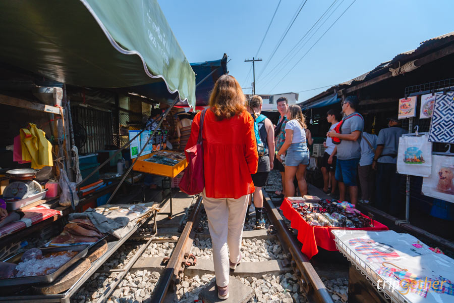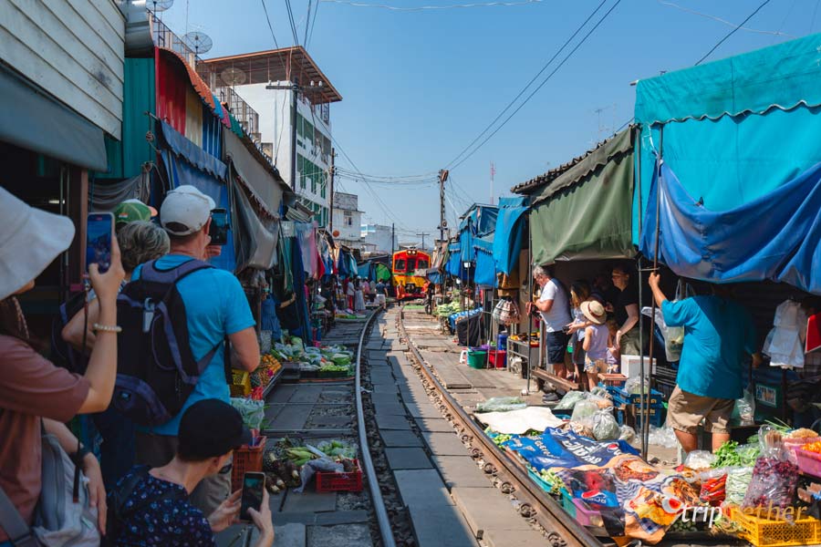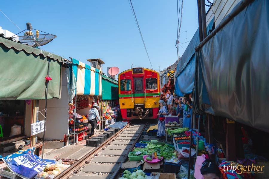 ไฮไลท์จะอยู่ตรงที่ เมื่อเราได้ยินเสียงหวูดแว่วมาจากสถานี เราจะเห็นพ่อค้าแม่ค้าต่างรีบหุบร่ม เก็บของกันด้วยความรวดเร็ว เพื่อเคลียร์ทางให้รถไฟเคลื่อนผ่านไป นี่จึงเป็นที่มาของชื่อ ตลาดร่มหุบนั่นเอง เรียกได้ว่าเป็นเสน่ห์อีกอย่างหนึ่งของที่นี่