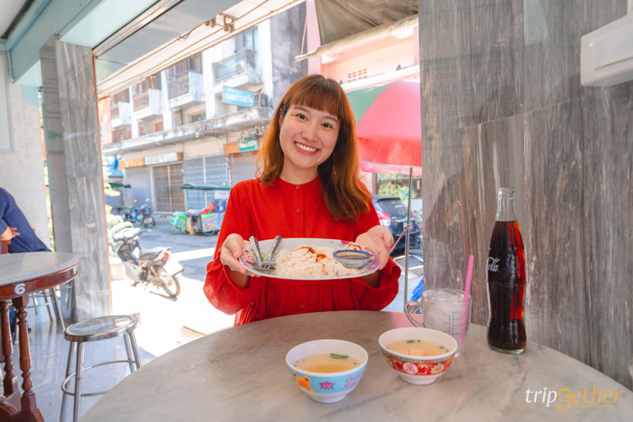 หลังจากถ่ายรูปได้คอนเท็นต์กันจนพอใจแล้ว เราแวะมาเช็คอินร้านอร่อยแถวๆ ตลาดแม่กลอง ร้านข้าวมันไก่ไทยสวัสดี ตัวร้านเป็นตึกแถวอยู่ตรงหัวมุม จุดสังเกตง่ายๆ อยู่ตรงข้ามกับธนาคารออมสิน เป็นอีกหนึ่งร้านเก่าแก่โดยตัวร้านอยู่ชั้นล่างของโรงแรมไทยสวัสดี โรงแรมเก่าแก่ในย่านนี้ ตัวอาคารยังคงรูปแบบดั้งเดิมอยู่เลย