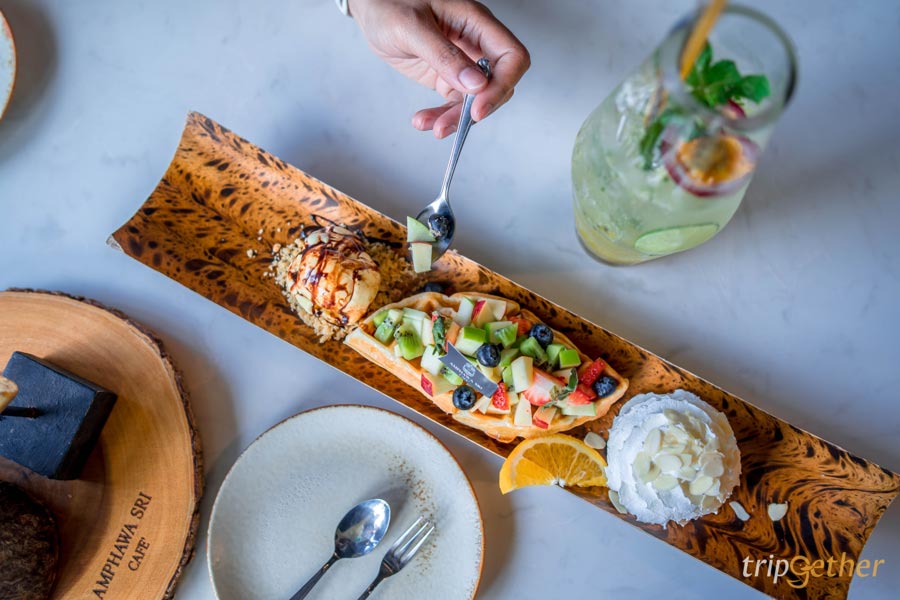 ปิดท้ายก่อนกลับ เราแวะกันมาที่ อัมพวาศรี คาเฟ่ คาเฟ่ริมน้ำอัมพวา ตกแต่งสุดอลังการงานสร้าง บรรยากาศภายในร้าน ตกแต่งสไตล์ Renaissance ส่วนของด้านในร้านตกแต่งไว้อย่างหรูหราผสมความวินเทจของเฟอร์นิเจอร์ที่จัดวางไว้อย่างลงตัวสุดๆ มาพร้อมบรรยากาศชิลล์ๆ