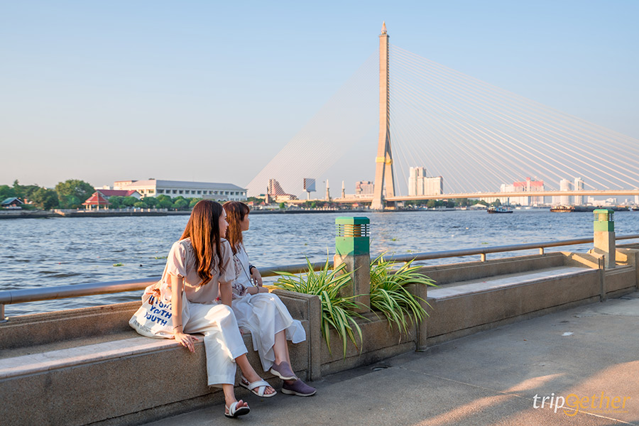 จากสวนสาธารณะ เราสามารถมองเห็นสะพานพระราม 8 เหนือแม่น้ำเจ้าพระยา ท่ามกลางแสงอาทิตย์สีส้มที่กำลังลับขอบฟ้า บรรยากาศชิลล์ๆ กับวิวหลักล้านช่วยฮีลใจและทำให้เราหายเหนื่อยจริงๆ