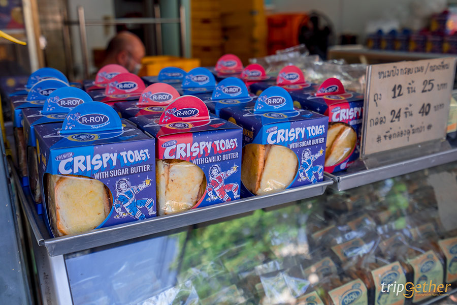 ขนมปังของร้านอร่อยจะมีอยู่ 2 รสชาติด้วยกัน ได้แก่ ขนมปังกรอบอบเนยและขนมปังกรอบอบกระเทียม เลือกซื้อได้ทั้งแบบถุงและกล่อง