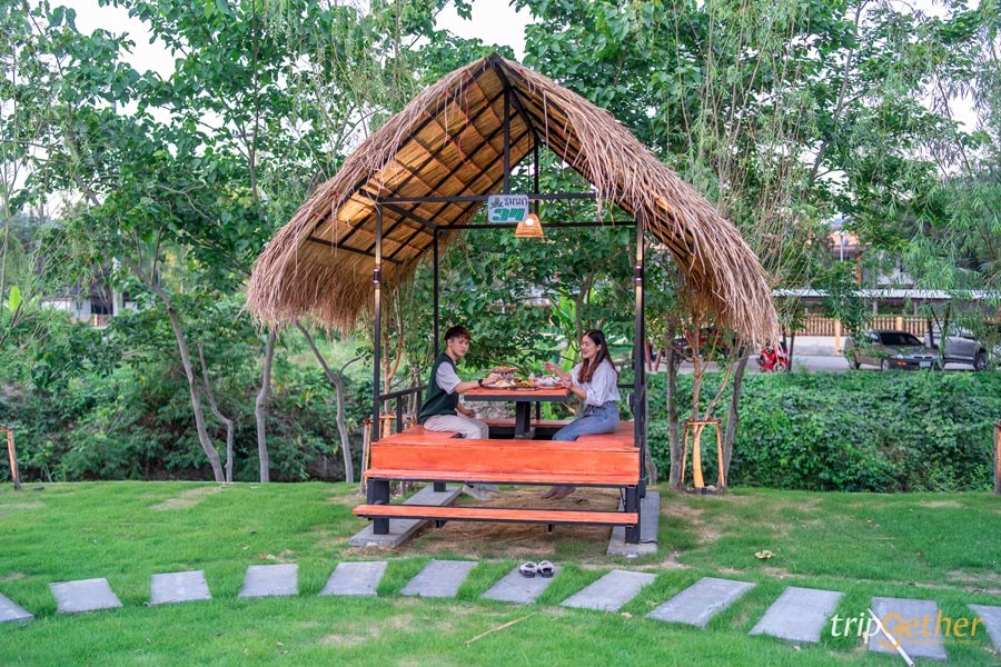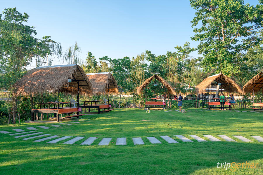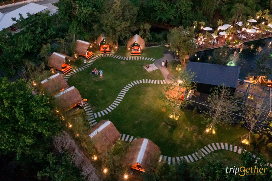 โซนต่อมาเป็นโซนเอาท์ดอร์ ที่มีอยู่ 2 รูปแบบด้วยกัน นั่นก็คือ โซนเอาท์ดอร์แบบกระท่อมที่ตั้งอยู่กลางลานหญ้าและติดกับริมลำธารเลย นอกจะจากนั่งได้แบบสบายๆ แล้ว ยังได้ความเป็นส่วนตัวสุดๆ เหมาะกับการพาครอบครัวมานั่งมากๆ