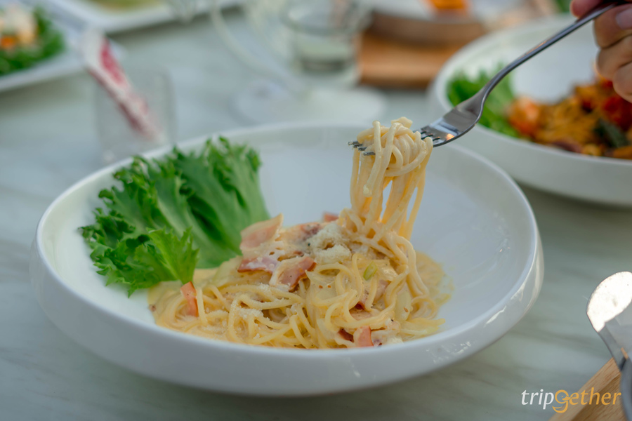 จานต่อมาเป็นเมนูสุดคลาสสิก นั่นก็คือ สปาเก็ตตี้คาโบนาร่า บอกเลยว่าอร่อยมาก ครีมซอสละมุนมากๆ รสชาติกลมกล่อมมากๆ ในราคา 150 บาท