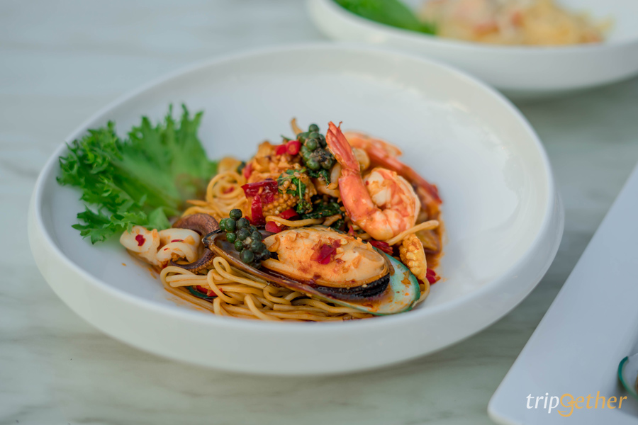 และเมนูอาหารฝรั่งฟิวชั่นยอดฮิตอีกเมนูก็คือ สปาเกตตี้ขี้เมาทะเล ที่เรียกได้ว่าแซ่บแบบไทยๆ กุ้ง หมึกแบบเน้นๆ ถูกใจคนแซ่บแน่นอน ราคาเพียง 180 บาท