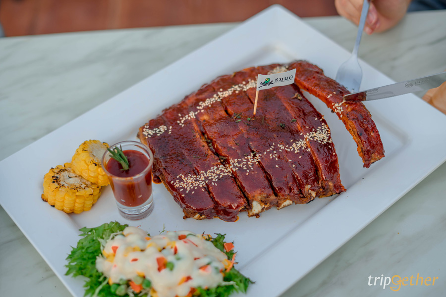 ซี่โครงหมูบาร์บีคิว ที่ใครเห็นก็ต้องตกใจในความใหญ่ เนื้อส่วนซี่โครงที่ทาซอสบาร์บีคิวมาอย่างชุ่มฉ่ำๆ ชิ้นโต รสชาติจัดว่าละมุนลิ้นสุดๆ ราคาอยู่ที่ 380 บาท คุ้มมากทุกคน