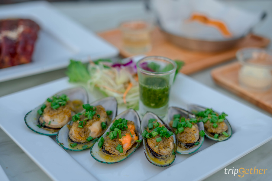 อาหารจานแรกที่เรายกมาแนะนำเลยก็คือหอยนิวซีแลนด์อบเนย หอยแต่ละตัวก็บิ๊กๆ ทั้งนั้น หอมเนยแบบสุดๆ กินคู่กับน้ำจิ้มซีฟู้ดรสแซ่บ บอกเลยฟิน! ราคาก็ไม่แรงเลย เพียงแค่ 180 บาทเท่านั้น