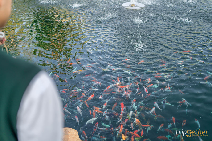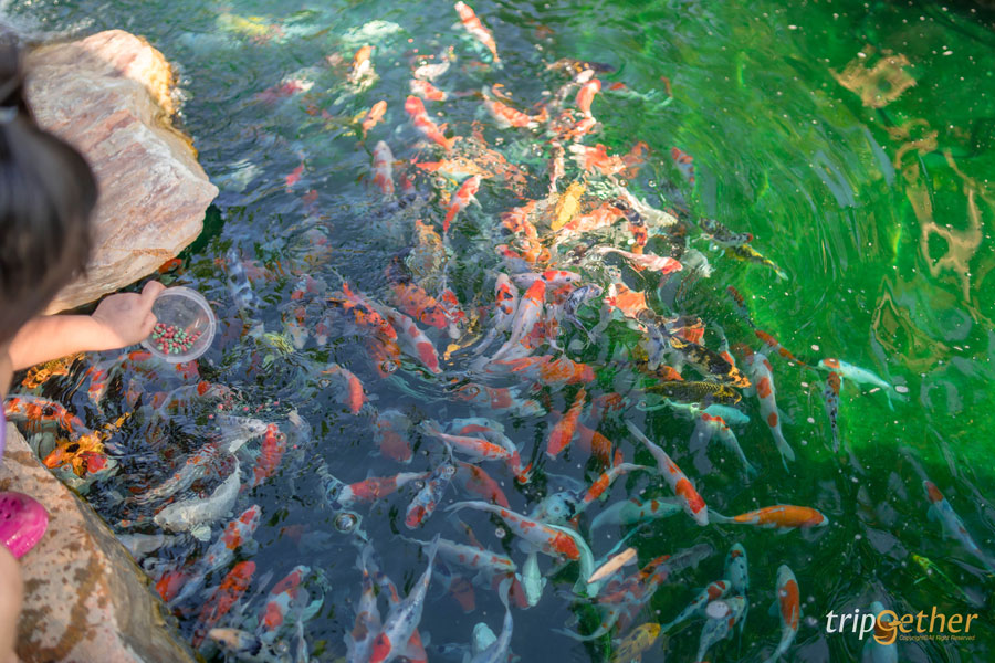 นอกจากนี้ยังสามารถให้อาหารปลาคาร์ปได้ด้วยนะ ระหว่างที่เรากำลังโปรยอาหารลงไปในน้ำ เหล่าปลาก็จะพากันว่ายมาแบบเป็นขบวนเลย แล้วก็จะว่ายวนไปมา ดูแล้วเหมือนกับภาพวาดของญี่ปุ่นเลยทุกคน