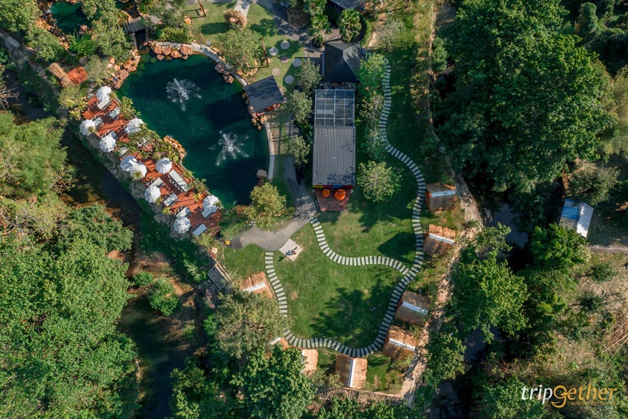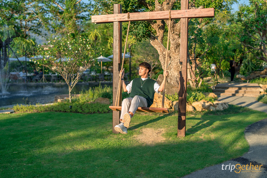 นอกจากสระน้ำแล้วยังมีลานกว้างที่เป็นทุ่งหญ้าสุดกรีนที่มีลำธารธรรมชาติล้อมรอบอยู่ นั่งพักสักหน่อยให้สายลมมาสัมผัสกายเบาๆ แล้วสูดลมหายในสักนิด บอกเลยว่าความสุขล้นแน่นอน