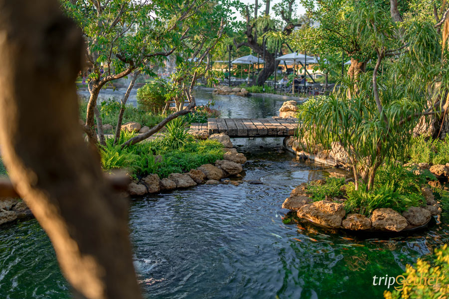 ทางเดินและสะพานที่พาดข้ามสายน้ำและมีต้นไม้มากมายและหลากสีสันขนาบข้างและกระจายอวดดอกใบกันทั้งทั่วบริเวณทำให้รู้สึกว่าเรากำลังเดินอยู่ท่ามกลางธรรมชาติในป่าที่อุดมสมบูรณ์ยังไงอย่างงั้น