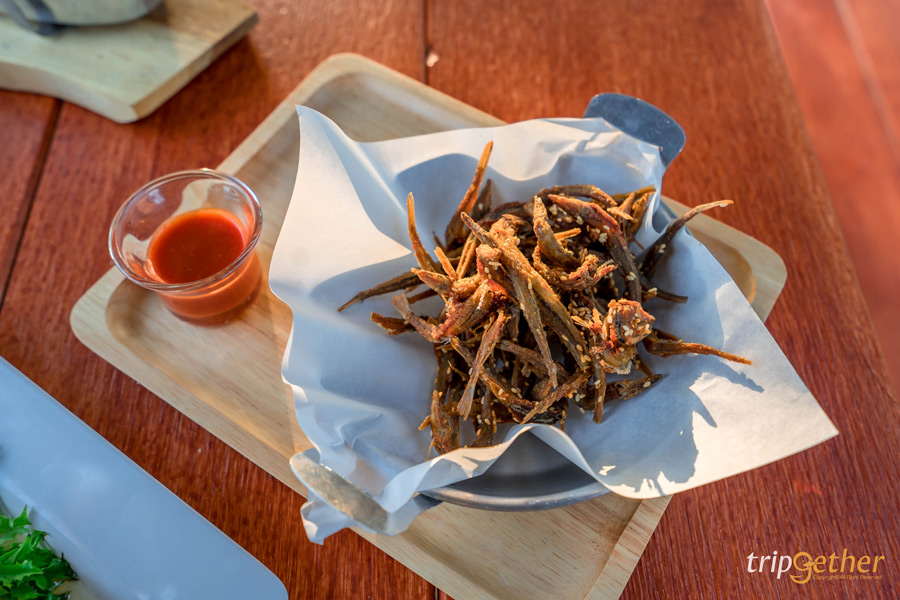 ปิดท้ายด้วยสองเมนูกินเพลิน อย่างเอ็นไก่ทอดกรุบ ๆ กับปลารากกล้วยทอด ร้อนๆ ราคาของทั้งสองเมนูคือเมนูละ 120 บาท รับรองว่าเคี้ยวสนุก จนอยากสั่งเพิ่มแน่นอน