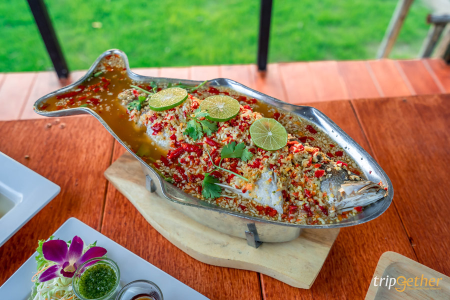 มาต่อกันที่สำรับอาหารไทยกันบ้างกับเมนูปลากะพงนึ่งมะนาว ปลาไซส์เป้ง เน้นขาวนวลแน่นๆ ราดด้วยน้ำจิ้มมะนาว พริก กระเทียม บอกเลยว่าฉ่ำ ซึ่งราคา 350 บาทเท่านั้น