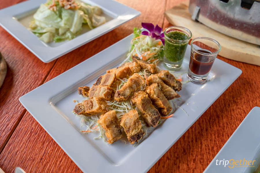 หมูกรอบทอดน้ำปลา กรอบเอาใจสายหมูกรอบมากๆ แต่ละชิ้นเคี้ยวแล้วดังกร๊วบ ยิ่งถ้าจิ้มกับน้ำจิ้มนะ บอกเลยฟิน ความฉ่ำนี้จานละ 150 บาท