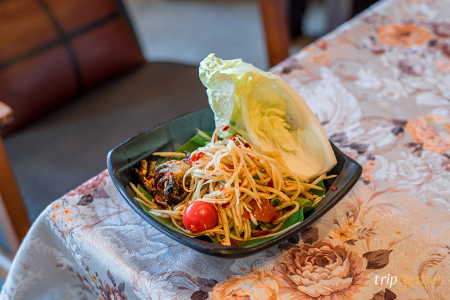 แนะนำอาหารเหนือกันเสร็จเรียบร้อยก็มาต่อที่เมนูทางอีสานกันบ้าง เริ่มที่เมนูน้องใหม่สุดแซ่บ ตำปูปลาร้า รสชาติครบรส เพิ่มความนัวขึ้นไปอีกด้วยปลาร้าและความเค็มหน่อยๆ ของปู ส่วนเส้นมะละกอที่ตำออกมากำลังดี เคี้ยวแล้วได้สัมผัสความกรุบกรอบของมะละกอ คุณภาพและรสชาติครบเครื่องแบบนี้ราคาเพียง 65 บาทเท่านั้น