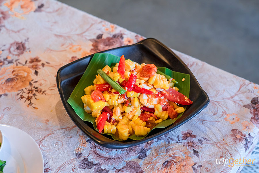 อีกเมนูตำที่ห้ามพลาด ตำข้าวโพดไข่เค็ม รสชาติเปรี้ยว เผ็ด หวานกลมกล่อม ตำรวมกับข้าวโพดหวานฉ่ำ ใส่ไข่เค็มเพิ่มความมันนัวให้กับน้ำยำ เป็นเมนูตำที่กินกี่ครั้งก็อร่อยไม่เบื่อ ราคาความแซ่บอยู่ที่ 65 บาท