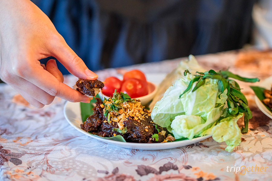 ต่อมาเป็นไฮไลท์ที่หากินได้ยากมากในกรุงเทพฯ ลาบควายดิบ เมนูที่ใครคิดถึงรสชาติลาบของทางเหนือต้องมาลองเลย แอบกระซิบว่าลาบควายดิบของทางร้านติด 1 ใน 3 ลาบดิบที่อร่อยของเชียงใหม่ด้วย โดยเนื้อควายนี้ส่งตรงมาจากเชียงใหม่ ผ่านการสับละเอียดและปรุงมาอย่างลงตัว สัมผัสของลาบจะนิ่มๆ ครีมมี่หน่อยๆ มีกลิ่นเครื่องเทศชัด สำหรับใครที่ไม่เคยกิน แนะนำให้กินคู่กับข้าวเหนียวจะกินได้ง่ายขึ้น ราคาอยู่ที่ 150 บาท