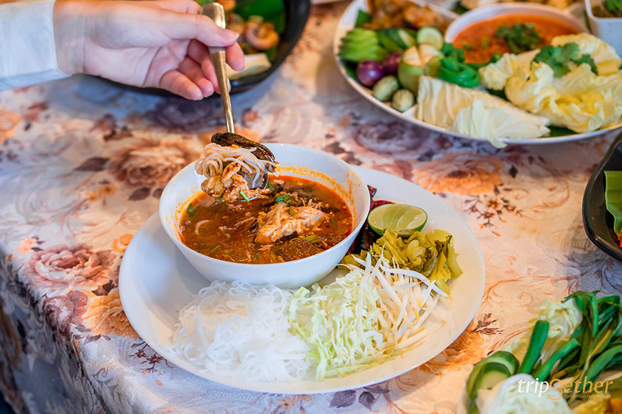 ขนมจีนน้ำเงี้ยว เสิร์ฟมาถ้วยใหญ่ๆ มีความกลมกล่อมเข้นข้นถึงเครื่องแกง
