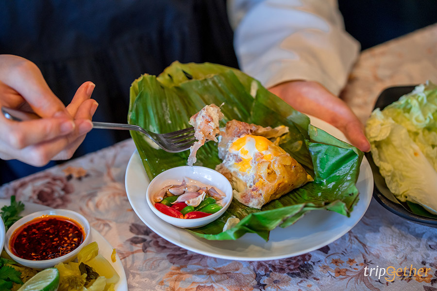 อีกหนึ่งเมนูที่ส่งตรงจากเชียงใหม่ แหนมหมกไข่ หรือจิ้นส้ม เป็นแหนมโปะไข่ห่อในใบตอง รสชาติเปรี้ยวกำลังพอดี เมื่อกินคู่กับไข่จะเพิ่มความนัวแบบที่กินได้เพลินๆ แถมช่วยตัดรสเปรี้ยวดีมาก มาในราคา 75 บาท