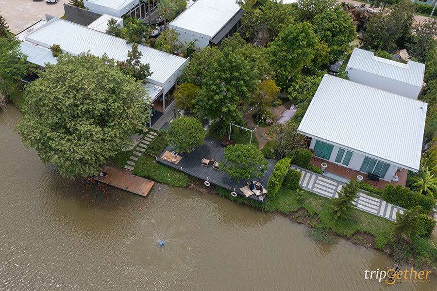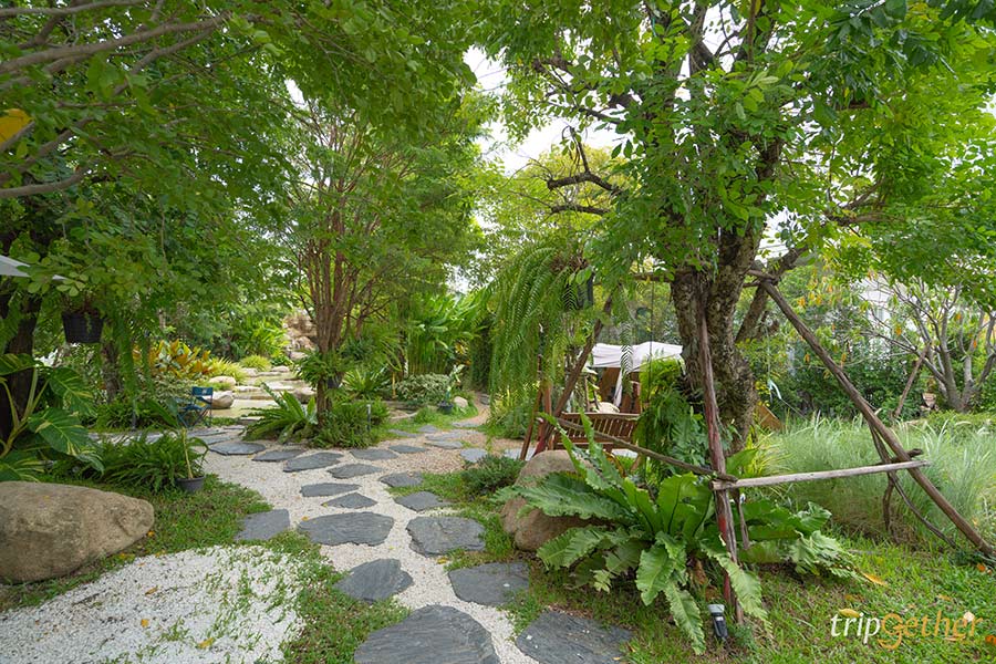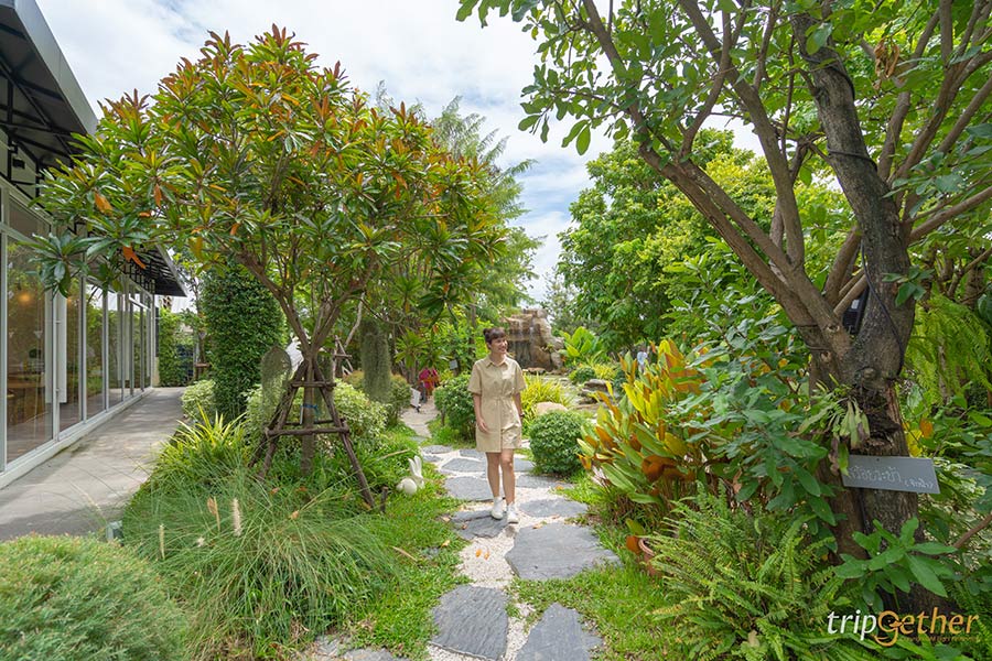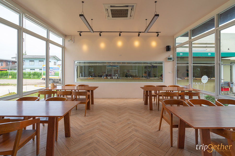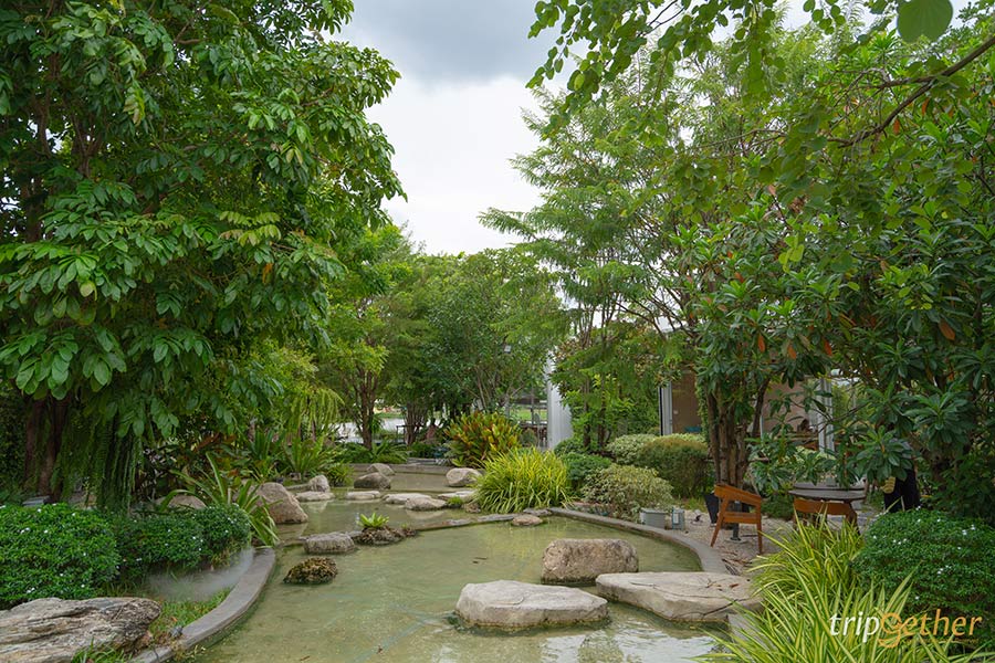 ภายในร้านมีพื้นที่กว่า 3 ไร่ มีการแบ่งสัดส่วนพื้นที่ได้อย่างลงตัว มีทั้งที่นั่งอินดอร์และเอาท์ดอร์ซึ่งจะแบ่งออกเป็น 3 โซนด้วยกัน ได้แก่ โซนอินดอร์ในห้องแอร์ 2 โซน เป็นห้องกระจกใสที่สามารถเห็นวิวสวนและต้นไม้ได้แบบเต็มๆ ตา และอีกโซนเป็นโอเพ่นแอร์ริมน้ำ นั่งรับลมสบายๆ จากริมน้ำก็ชิลล์มากๆ และถ้าอยากพาน้องหมาน้องแมวมาด้วย ทางร้านก็พร้อมต้อนรับแต่ต้องนั่งที่โซนเอาท์ดอร์โอเพ่นแอร์เท่านั้น นอกจากนี้ใครต้องการพื้นที่ส่วนตัวหรือจัดเลี้ยงเฉพาะกลุ่ม ทางร้านก็มีห้องไพรเวทรูมที่รองรับคนได้มากถึง 30 คน ซึ่งใครอยากจองห้องไพรเวทรูมแบบนี้ต้องจองล่วงหน้าเท่านั้น