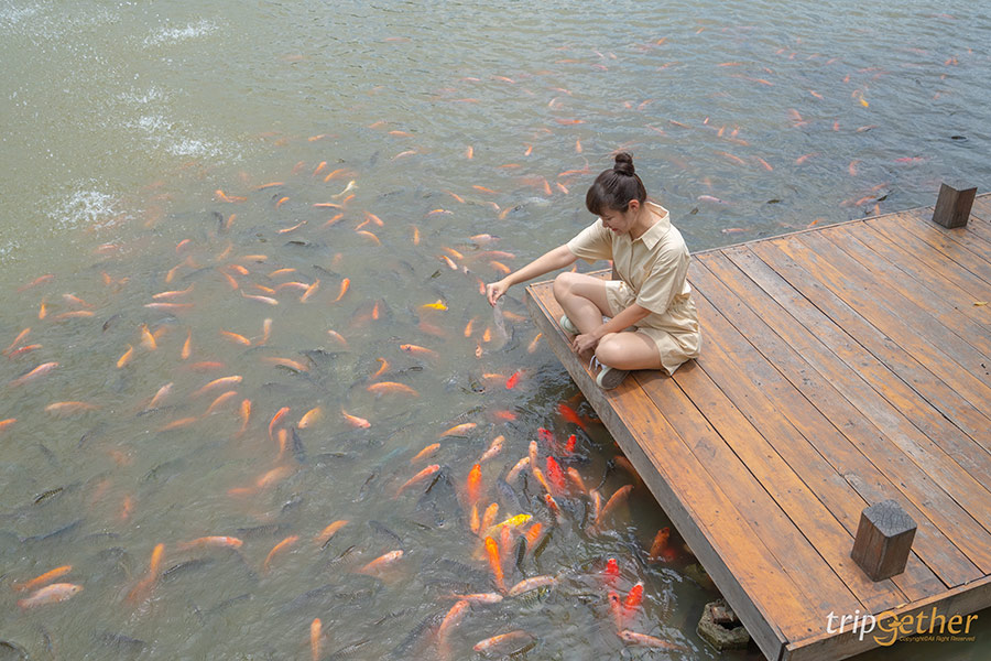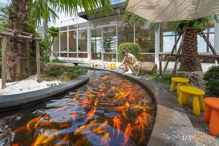 สำหรับการให้อาหารปลาคาร์ปจะมีอยู่ 2 จุด ก็คือบ่อเล็กๆ ในสวนที่อยู่ระหว่างโซนที่นั่งห้องแอร์ มุมนี้เหมาะกับพาเด็กๆ มานั่งให้อาหารปลามาก และอีกจุดคือสระน้ำใหญ่ที่อยู่ข้างๆ โซนนั่งเอาท์ดอร์ เป็นสะพานไม้เดินลงไปริมสระน้ำ ซึ่งนอกจากปลาคาร์ป ตรงนี้มีปลาหลากหลายชนิดมาก ส่วนอาหารปลาสามารถซื้อได้จากในร้านเลย ราคาถุงละ 20 บาทเท่านั้น