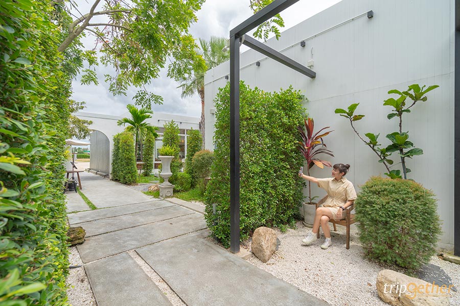 เริ่มตั้งแต่ทางเข้าร้านมีพื้นที่กว้างมาก สำหรับใครที่ขับรถมาทางร้านก็มีที่จอดรถรองรับได้เกือบ 100 คัน ตัวร้านตั้งอยู่ริมสระน้ำทำให้เพียงแค่ลงจากรถก็สัมผัสได้ถึงลมอ่อนพัดมาสบายๆ บวกกับร้านที่ทาด้วยโทนสีขาวดูสบายตา มีต้นไม้ตกแต่งอยู่รอบๆ ทางเข้าร้านมีกำแพงน้ำตกไหลอยู่ระหว่างทางเข้าร้าน บอกเลยว่าแค่บรรยากาศทางเข้าก็ชิลล์สุดๆ และหลังจากเดินเข้ามาในร้านก็ดูร่มรื่นและโล่งโปร่ง มีทั้งต้นไม้ สวน และบ่อน้ำ ให้ความรู้สึกผ่อนคลาย ใกล้ชิดกับธรรมชาติ เหมาะแก่การแวะมาพักผ่อนสบายๆ ในวันหยุด