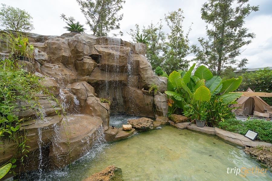 ต่อมาก็เอาใจสายโซเชียลกันต่อกับมุมถ่ายรูปในร้านที่เรียกได้ว่ามีมุมถ่ายรูปสวยๆ เยอะมาก โดยมุมถ่ายรูปมีตั้งแต่ทางเข้าร้านที่เป็นกำแพงน้ำตก ซึ่งเป็นมุมยอดฮิตที่ใครมาต่างก็อดใจไม่ไหวต้องหยิบกล้องมาถ่ายรูปกันตั้งแต่หน้าร้านเลย และเมื่อเดินเข้ามาในร้านก็มีมุมถ่ายรูปคู่กันกราฟฟิตี้ หรือจะเดินเล่นในสวนที่มีไฮไลท์เป็นน้ำตกจำลอง มีลำธารสายเล็ก และโขดหินต่างๆ ให้ฟีลเหมือนเดินอยู่กลางป่าอย่างไงอย่างงั้นเลย นอกจากนี้ทางร้านยังสร้างบรรยากาศด้วยเต็นท์และอุปกรณ์สำหรับแคมป์ปิ้ง บอกเลยว่าถ่ายรูปอัปลงโซเชียลนึกว่ามาตั้งแคมป์จริงๆ หรืออยากถ่ายรูปเก๋ๆ ก็มีมุมนั่งปิกนิกริมน้ำ มาร้านนี้แค่เตรียมกล้องให้พร้อม กดชัตเตอร์รัวๆ ก็ได้รูปกลับไปเพียบ!