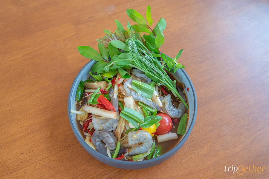 ความแซ่บยังไม่จบมาต่อกันที่ ตำกุ้งสดไหลบัว ราคา 150 บาท ตักมาคำแรกก็ได้รับความหวานและกรุบกรอบของสายบัว กินพร้อมกับกุ้งสดเด้งๆ ขนาดพอดีคำ สุดท้ายซดน้ำยำครบรส เพิ่มความนัวด้วยน้ำปลาร้าอีกสักนิด บอกเลยว่ารสแซ่บนัวถึงใจมาก และอยากจะบอกว่าปลาร้าของที่นี่กินค่อนข้างง่าย คนที่ไม่กินปลาร้าก็สามารถกินได้ แต่ถ้าใครไม่อยากกินปลาร้าจริงๆ ก็สามารถบอกกับพนักงานได้ว่าไม่ใส่ปลาร้า