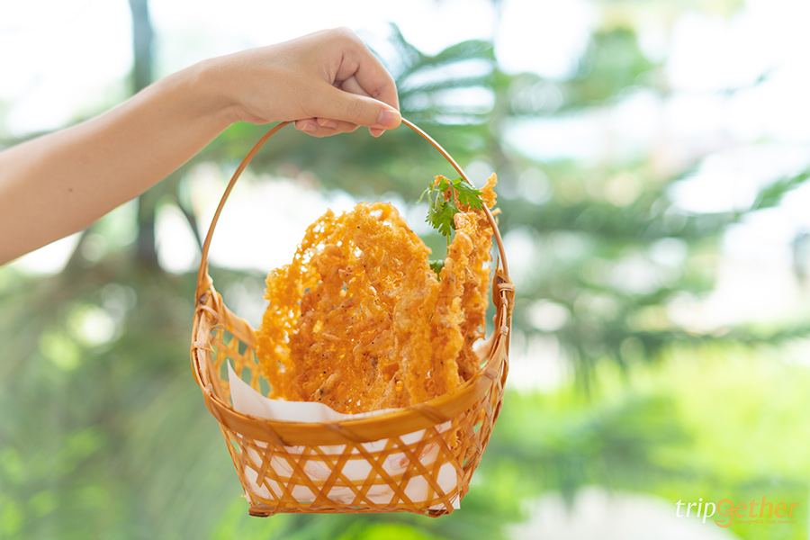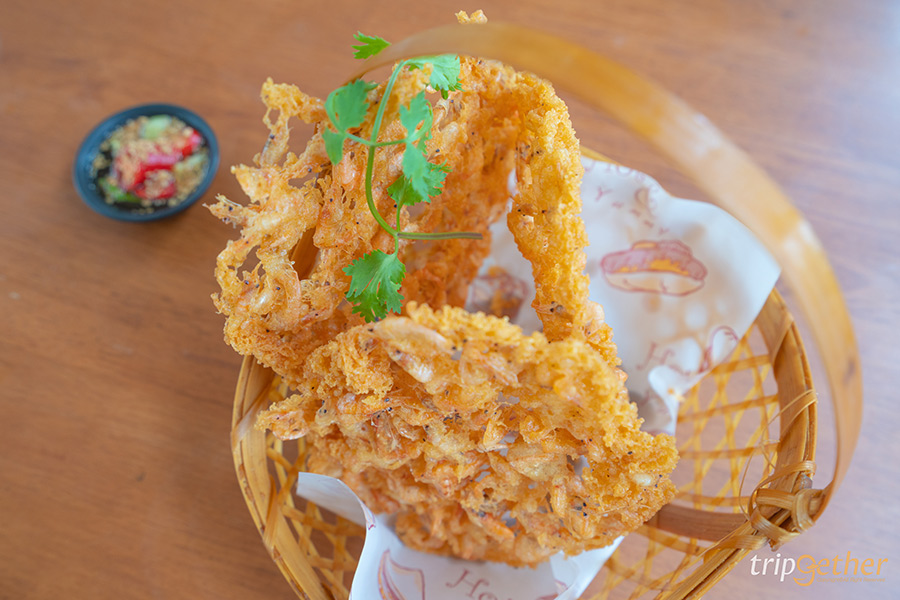 ต่อมาเป็นเมนูกินเล่นที่น่าจะเป็นที่ชอบของใครหลายคน กุ้งแพทอด 120 บาท เสิร์ฟใส่ตะกร้าไม้ไผ่อย่างน่ารัก ส่วนตัวกุ้งแพเป็นแป้งทอดกรอบกับเนื้อกุ้ง ทางร้านก็ให้เนื้อกุ้งมาแบบจัดเต็มชนิดที่ว่ากัดเข้าไปเจอเนื้อกุ้งทุกคำ ที่สำคัญทอดมาอย่างกรอบมากและหอมเนื้อกุ้งสุดๆ ยิ่งกินคู่กับน้ำจิ้มที่เสิร์ฟมาคู่กับกุ้งแพทอดเข้ากันมาก เป็นเมนูกินง่ายๆ ที่กินรองท้องก่อนอาหารจานหลักดีมาก