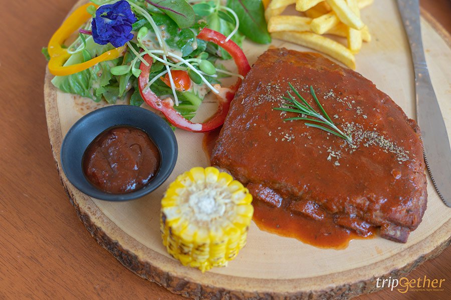 มาเริ่มกันที่เมนูแรกซึ่งเป็นเมนูน้องใหม่ ซี่โครงกระดูกหมูอบซอสบาร์บีคิว ราคา 379 บาท บอกเลยว่าคุ้มมาก ได้ซี่โครงกระดูกหมูชิ้นโตๆ และที่สำคัญเนื้อเปื่อยมาก แค่แกะๆ เนื้อก็ร่อนออกจากกระดูกแล้ว ยิ่งกินคู่กับซอสบาร์บีคิวที่ราดมาด้วย เนื้อฉ่ำมากๆ นอกจากนี้ยังมีเครื่องเคียงอย่าง เฟรนช์ฟรายส์ ข้าวโพด และสลัด กินตัดเลี่ยนได้อย่างลงตัว