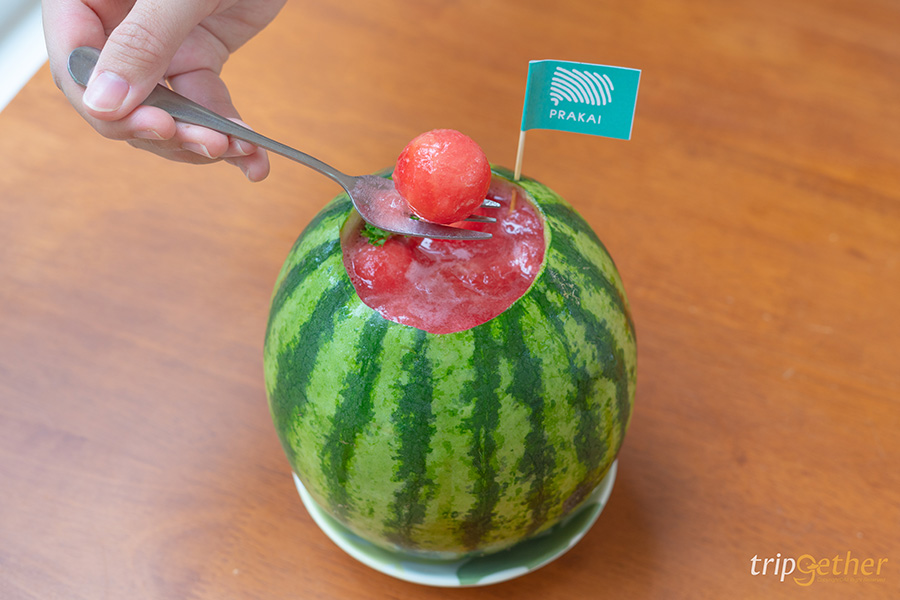 และสุดท้ายเป็นเมนูเครื่องดื่ม ซึ่งที่ร้านมีให้เลือกหลายเมนูมาก ไม่ว่าจะเป็นชา กาแฟ น้ำผลไม้ ค็อกเทล ส่วนเมนูที่สั่งมาในวันนี้เริ่มจากเมนูซิกเนเจอร์อย่าง แตงโมปั่น ที่เสิร์ฟมาเป็นลูกๆ ข้างในเป็นน้ำแตงโมปั่น พร้อมเนื้อแตงโมขนาดพอดีคำ บอกเลยว่าใครอยากกินอะไรที่เฟรชๆ รู้สึกสดชื่น ต้องสั่งเมนูนี้ให้ได้ แถมได้แตงโมเป็นลูกๆ แบบนี้ราคาเพียง 99 บาทเท่านั้น