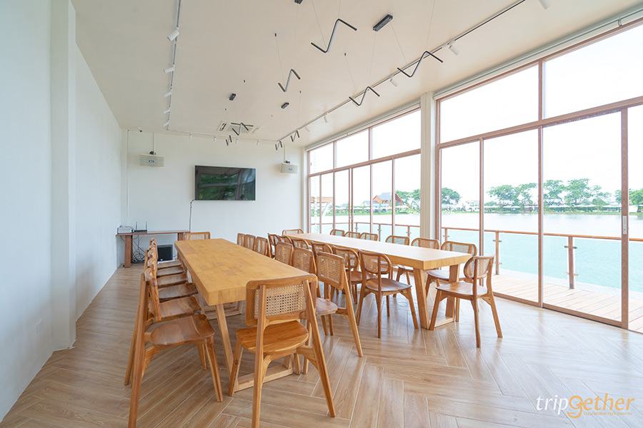 ส่วนห้องไพรเวท บอกเลยว่าเป็นส่วนตัวสุดๆ เพราะเป็นอาคารเดี่ยวที่แยกออกมา ตัวอาคารเป็นอาคารสีขาว 2 ชั้นอยู่ติดริมน้ำ ชั้นล่างเป็นห้องแอร์ ส่วนชั้นบนเป็นดาดฟ้า ยิ่งมาในช่วงเย็นๆ บรรยากาศคือชิลล์มาก