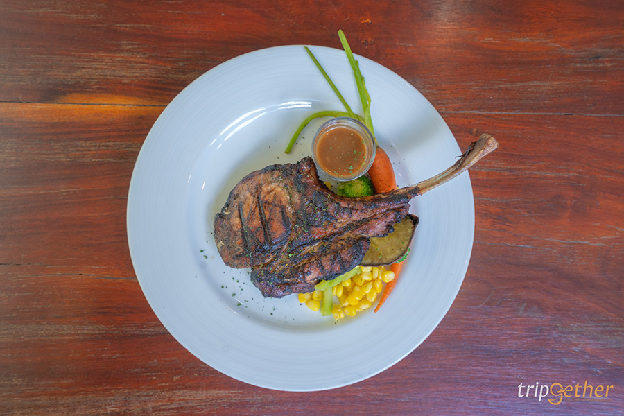 มาต่อที่สเต็กจานถัดไป เป็นเมนูสเต็กหมูโทมาฮอค 350 กรัม สำหรับใครที่ไม่กินเนื้อก็เลือกเมนูนี้ได้ โดยเมนูนี้จะใช้เวลาย่าง 25 นาที เชฟจะค่อยๆ ย่างอย่างพิถีพิถันจนสุก ตัดแต่งใส่จานมาเสิร์ฟอย่างสวยงาม พร้อมน้ำจิ้มและผักลวก บอกเลยว่าจานนี้ชิ้นใหญ่มาก อิ่มคุ้มแน่นอน ราคาอยู่ที่ 450 บาท