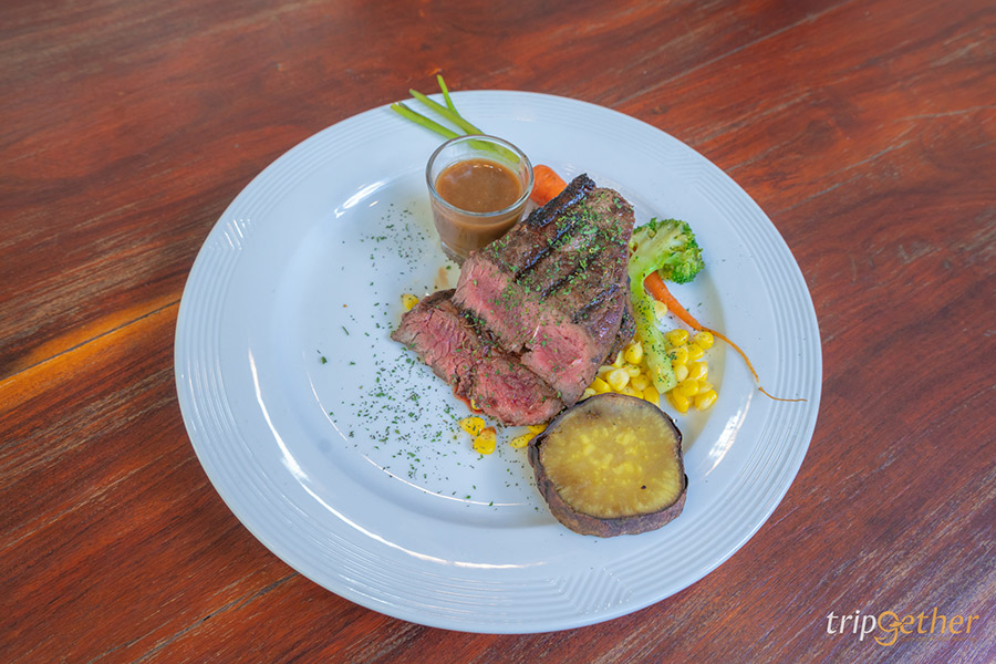 มาเริ่มกันที่เมนูแรก สเต็กเนื้อสันนอกซุปเปอร์พรีเมี่ยม ในจานเสิร์ฟมาพร้อมน้ำจิ้มและผักลวก บอกเลยว่าจานนี้เด็ดมาก เนื้อนุ่มละมุนลิ้น รสชาติเข้มข้น กินพร้อมเครื่องเคียงก็เข้ากันสุดๆ โดยสเต็กเนื้อสันนอกจะมีให้เลือกตั้งแต่สแตนดาร์ด พรีเมี่ยม และซุปเปอร์พรีเมี่ยม ส่วนราคาจะอยู่ที่ 700, 800 และ 900 ตามลำดับ