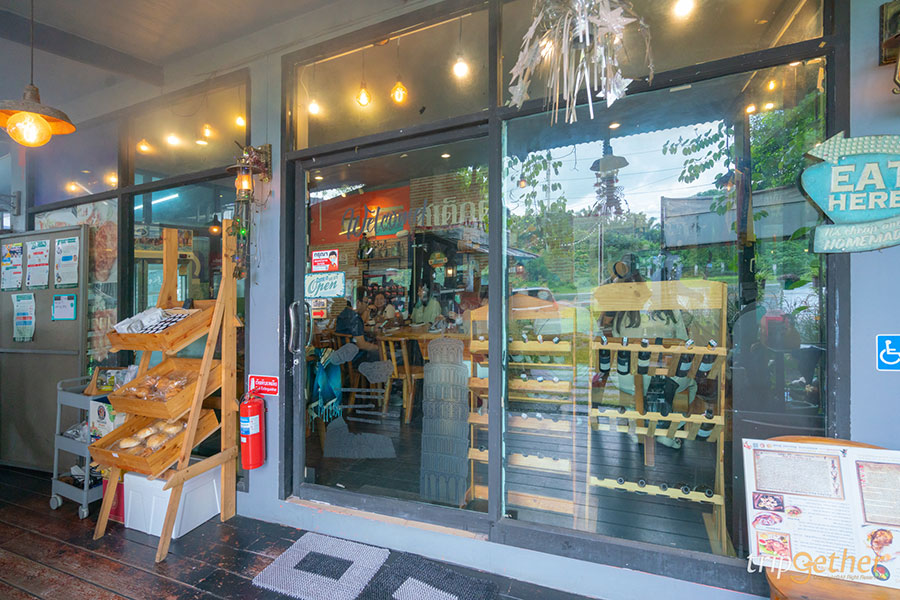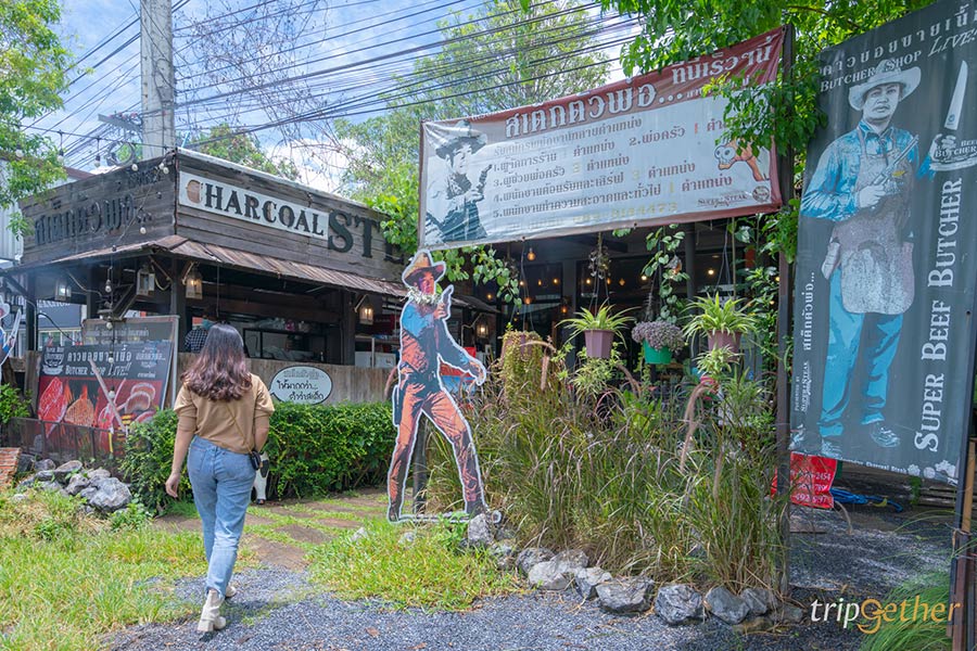 ตัวร้านตกแต่งแบบเรียบง่าย เน้นโทนสีดำน้ำตาล เข้ากับของตกแต่งฟีลคาวบอยนิดๆ ให้บรรยากาศสบายๆ เหมือนมากินข้าวที่บ้านเพื่อน โซนที่นั่งมีทั้งโซนอินดอร์ในห้องแอร์เย็นฉ่ำและโซนเอาท์ดอร์นั่งในสวน ตกแต่งด้วยไม้ประดับเสริมความร่มรื่นให้กับโซนที่นั่งด้านนอก