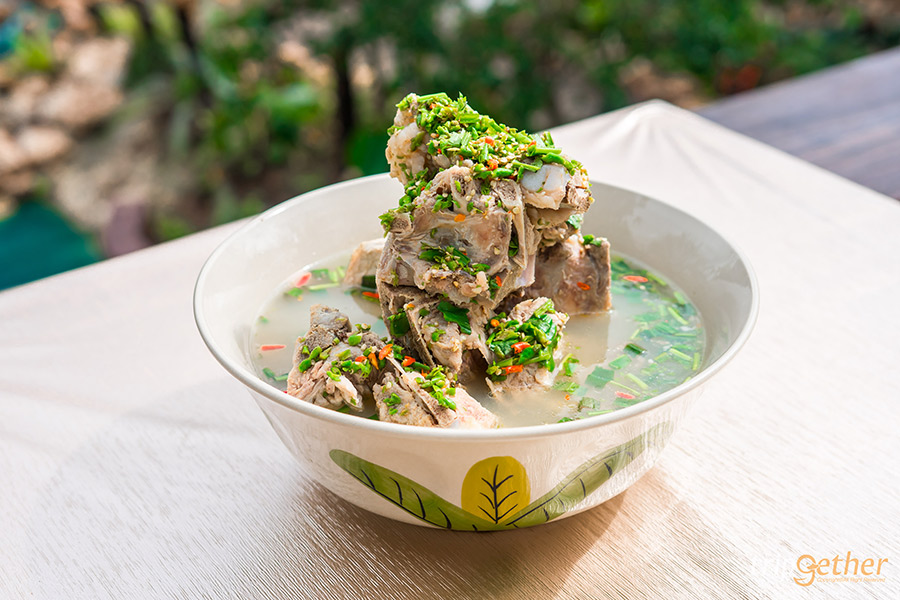 เริ่มต้นเมนูแรกด้วย ต้มเล้งแซ่บ (ถ้วยยักษ์) ราคา 420 บาท ความพิเศษของถ้วยนี้คือการใช้เล้งเกือบ 2 กิโลกรัมมาต้มในซุปกระดูกหมู เคี่ยวเล้งให้เปื่อยนุ่มและปรุงรสให้เผ็ดแซ่บด้วยพริกขี้หนู น้ำปลา มะนาว บอกเลยว่าซดน้ำซุปเข้าไปคำแรกได้ความเผ็ดร้อนและเปรี้ยวตาม ส่วนเนื้อหมูก็ต้มเปื่อยดีมาก เลาะออกจากกระดูกได้อย่างง่าย บอกเลยว่าเป็นเมนูไซส์ยักษ์ที่เหมาะกับการไปเป็นกลุ่ม สั่งมากินด้วยกัน ซึ่งปริมาณที่ร้านเสิร์ฟนี้สามารถแชร์ได้ตั้งแต่ 5 – 10 คน