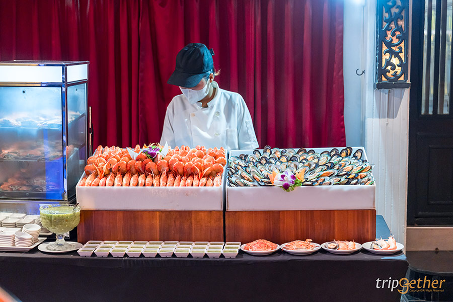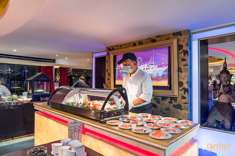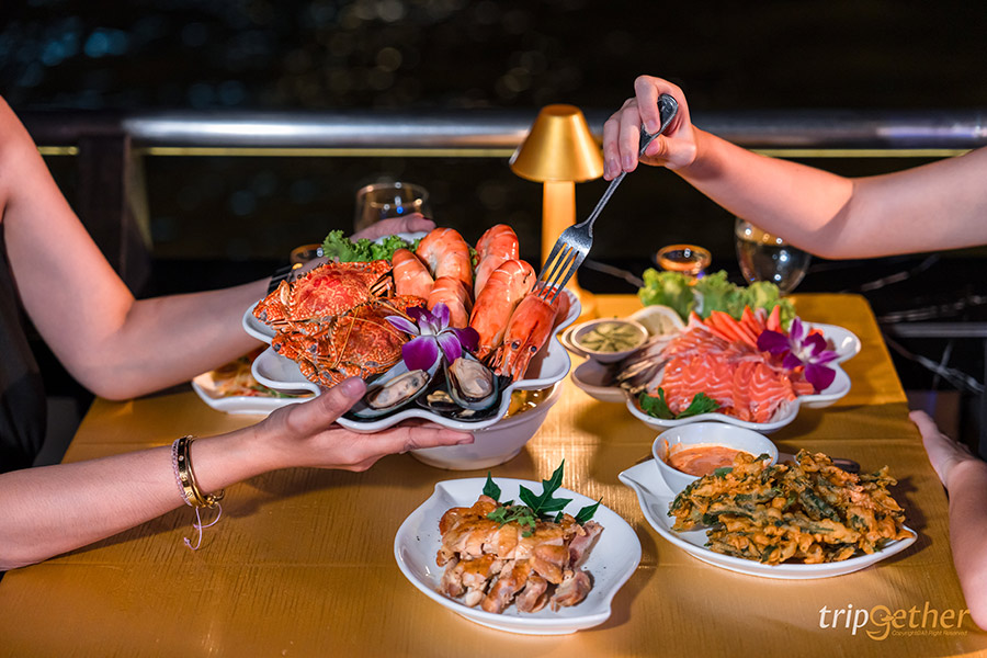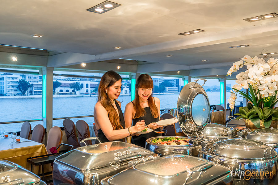 อีกหนึ่งไฮไลท์ของการล่องเรือเจ้าพระยาก็คือ อิ่มอร่อยกับบุฟเฟ่ต์นานาชาติและอาหารทะเล เสิร์ฟซีฟู้ดแบบจัดเต็ม ไม่ว่าจะเป็น กุ้งแม่น้ำออนไอซ์ หอยแมลงภู่นิวซีแลนด์ ปูม้า หอยหวาน หรือใครเป็นสายเจแปนนีสเลิฟเวอร์ก็มี แซลมอนซาชิมิ ปลาซาบะ ซูชิ นอกจากนี้ยังมีอาหารไทยและยุโรปอีกเพียบ ส่วนใครที่อยากนั่งดริ๊งก์เบาๆ ก็สามารถสั่งเพิ่มได้ ซึ่งในส่วนของเครื่องดื่มนี้จะมีค่าใช่จ่ายเพิ่มเติม แต่ตอนนี้ทางเรือมีโปรโมชั่นพิเศษ ไปกัน 8 คน แถมฟรี 1 ขวดไปเลย!