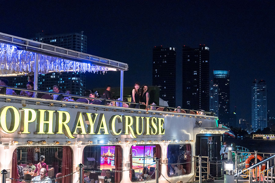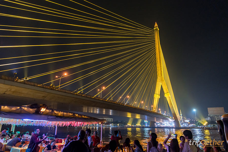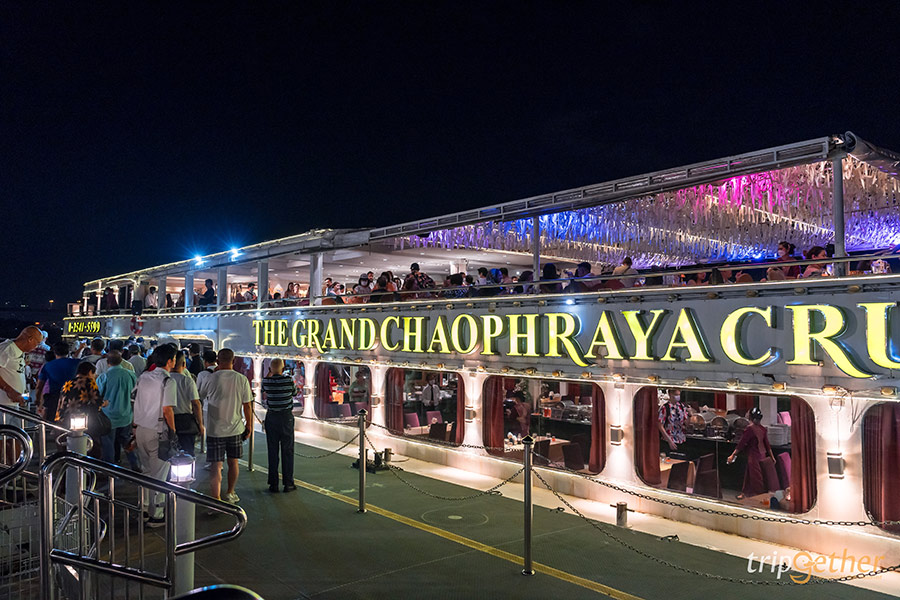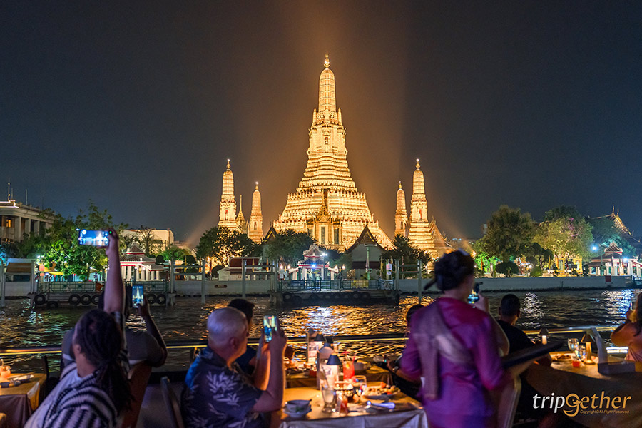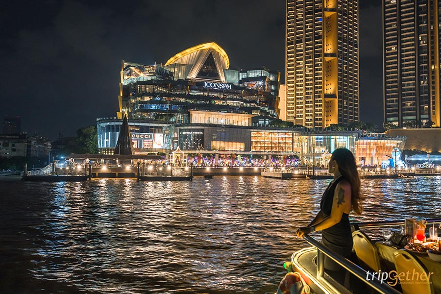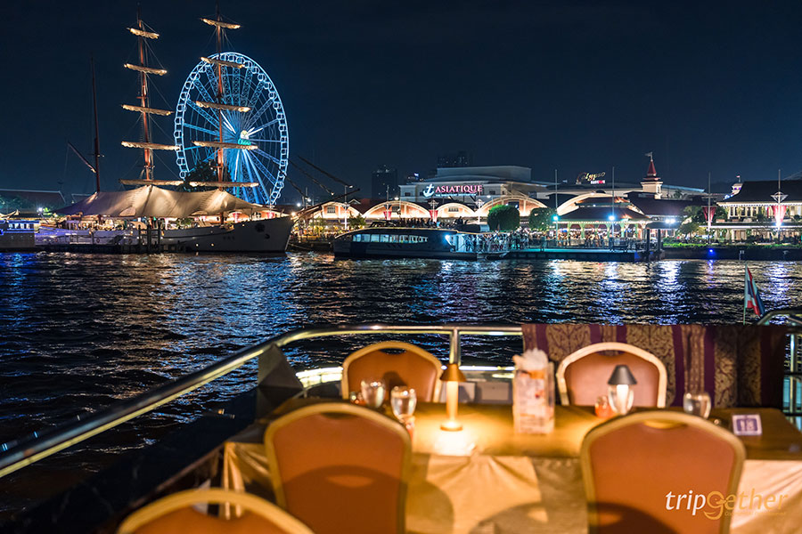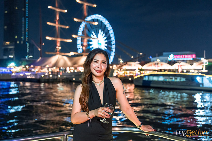ช่วงเวลาอันแสนพิเศษสามารถเริ่มต้นได้ที่ เรือเจ้าพระยาครุยส์ (The Grand Chaophraya Cruise) เรือหรูลำใหญ่ที่จะพาทุกคนไปตื่นตากับบรรยากาศยามค่ำคืนของแม่น้ำเจ้าพระยา ความสวยงามของแม่น้ำสายนี้คือเรื่องราวระหว่างทางที่เต็มไปด้วยประวัติศาสตร์และวิถีชีวิตผู้คน ตลอดการล่องเรือเราจะได้ชมสีสันและแสงไฟตระการตา โดยเส้นทางการเดินเรือนี้จะแล่นเป็นวงกลมเริ่มจากท่าเรือเอเชียทีคและไปสิ้นสุดที่สะพานพระราม 8 หลังจากนั้นเรือก็จะกลับมาส่งที่ท่าเรือเอเชียทีค ระยะเวลากว่า 2 ชั่วโมง เราจะได้ผ่านจุดไฮไลท์มากมาย ไม่ว่าจะเป็น วัดอรุณ วัดพระแก้ว สะพานพระราม 8 ICONSIAM ท่ามหาราช