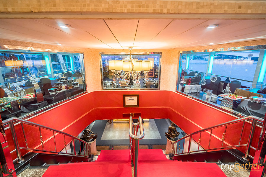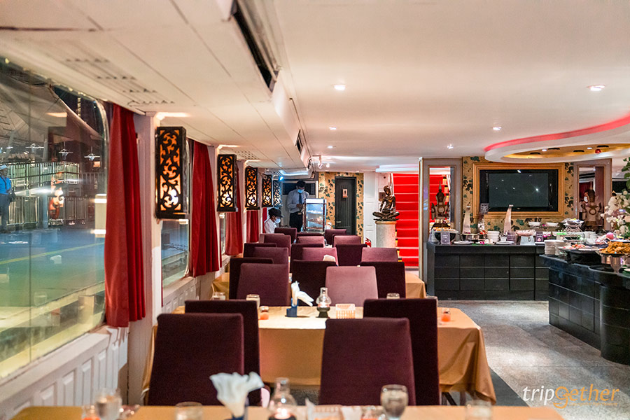 มาต่อที่ชั้นล่างจะเป็นโซนห้องแอร์ บรรยากาศเรียบง่ายและสบายตา ในขณะเดียวกันก็ยังคงความหรูหราด้วยโทนสีแดง ทอง และม่วง อีกทั้งยังมีหน้าต่างบานใหญ่อยู่รอบๆ ทำให้เห็นวิวแม่น้ำเจ้าพระยาอย่างใกล้ชิด บอกเลยว่าวิวชั้นล่างก็สวย และได้ตื่นตากับแสงสีไม่ต่างจากชั้นดาดฟ้าเลย สำหรับมุมนี้อาจจะเหมาะกับครอบครัวหรือผู้ใหญ่ที่อยากนั่งพักผ่อน ตากแอร์เย็นๆ