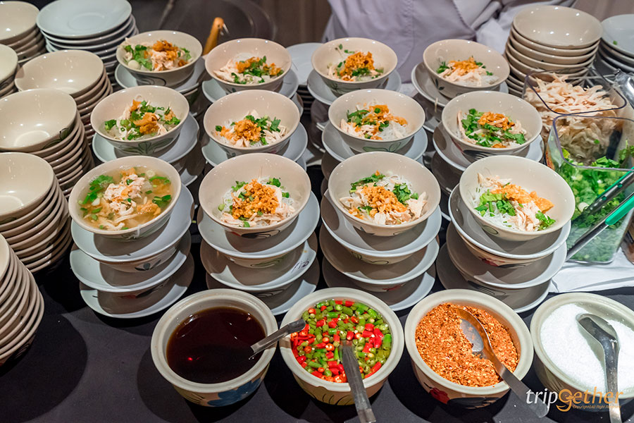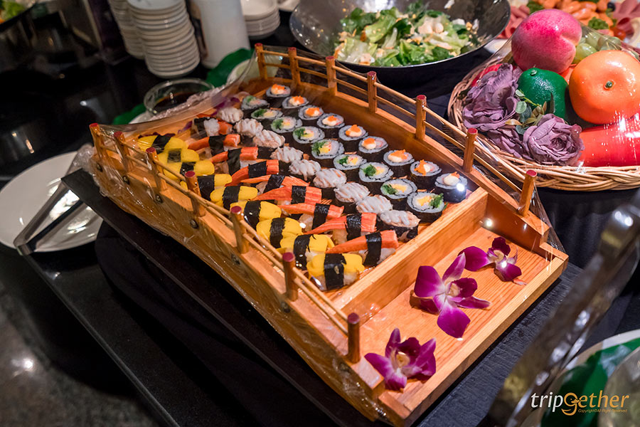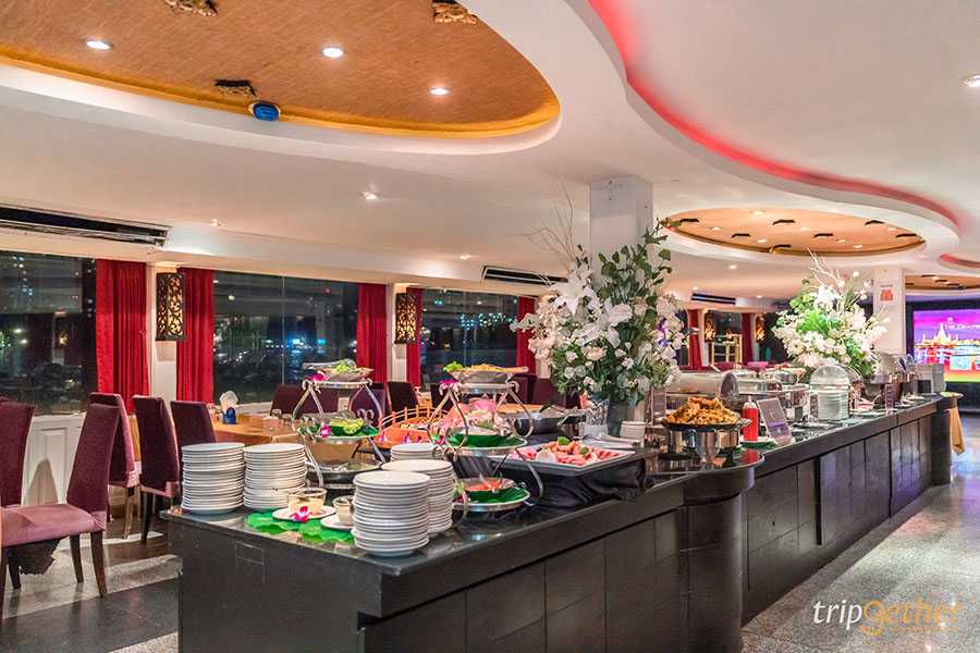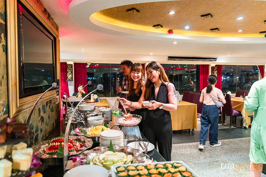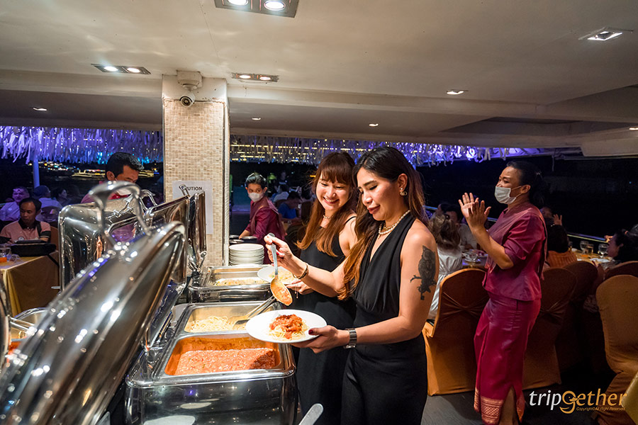 ไลน์อาหารบุฟเฟ่ต์มีให้เลือกหลากหลายและจะอยู่บริเวณกลางเรือ สามารถเดินมาตักได้เรื่อยๆ ไม่ว่าจะเป็นข้าวผัดกุ้ง ต้มยำกุ้ง สปาเก็ตตี้ แกงมัสมั่นไก่ ยำผักบุ้งกรอบ หรือใครอยากกินก๋วยเตี๋ยวร้อนๆ ก็มีเช่นกัน