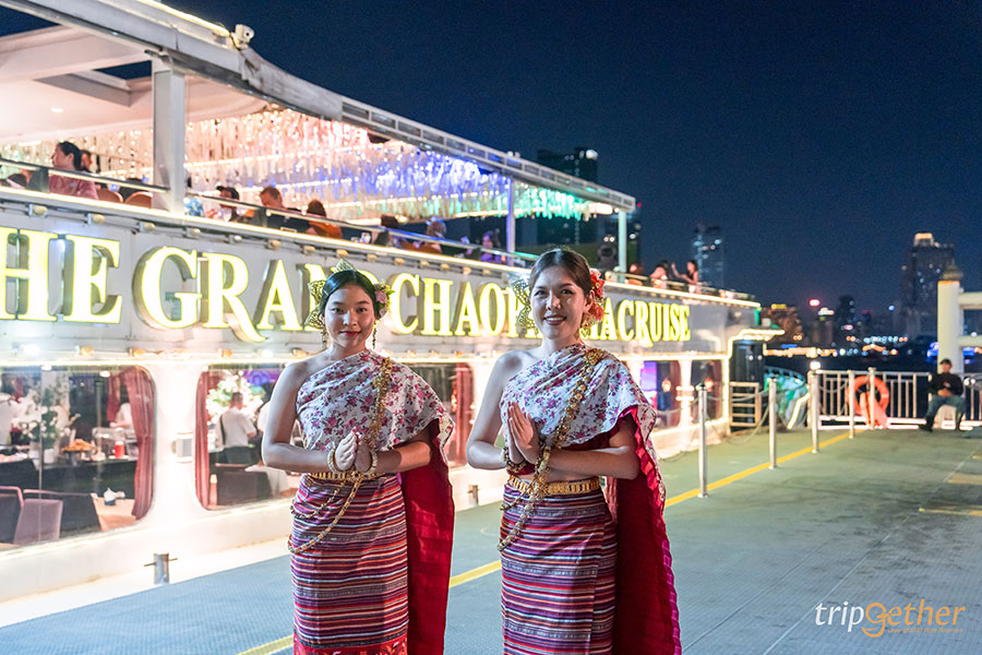 ใครที่อยากมีโมเมนต์พิเศษกับเรือเจ้าพระยาครุยส์ สามารถจองที่นั่งล่วงหน้าผ่าน https://lin.ee/wmLTC8U และถ้าอยากได้ที่นั่งดีๆ ก็จะต้องรีบจองกันหน่อย ยิ่งวันเสาร์ – อาทิตย์คนเยอะมาก และบริการล่องเรือจะมีทุกวัน เริ่มตั้งแต่เวลา 19.15 – 21.15 น. (2 ชั่วโมง) ที่สำคัญเรือออกตรงเวลามาก ห้ามเลทเด็ดขาด! จุดขึ้นเรืออยู่บริเวณท่าเรือเอเชียทีค เมื่อถึงเวลาที่เรือจอดเทียบท่า ทางเรือก็เตรียมการแสดงรำไทยต้อนรับ เป็นความน่ารักและแสดงถึงความใส่ใจเหมือนกับว่าเราเป็นแขกพิเศษ อีกทั้งยังเป็นการส่งต่อความสวยงามวัฒนธรรมไทยให้ชาวต่างชาติอีกด้วย บอกเลยว่าแค่เริ่มทริปล่องเรือก็ประทับใจมากแล้ว